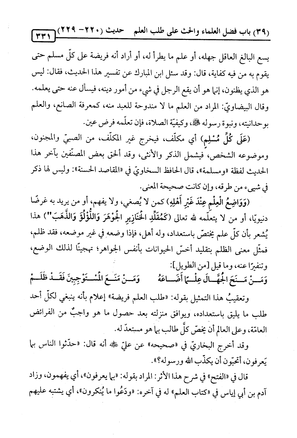 يسع البالغ العاقل جهله، أو علم ما يطرأ له، أو أراد أنه فريضة على كلّ مسلم حتى يقوم به من فيه كفاية، قال: وقد سئل ابن المبارك عن تفسير هذا الحديث، فقال: ليس هو الذي يظنون، إنما هو أن يقع الرجل في شيء من أمور دينه، فيسأل عنه حتى يعلمه.