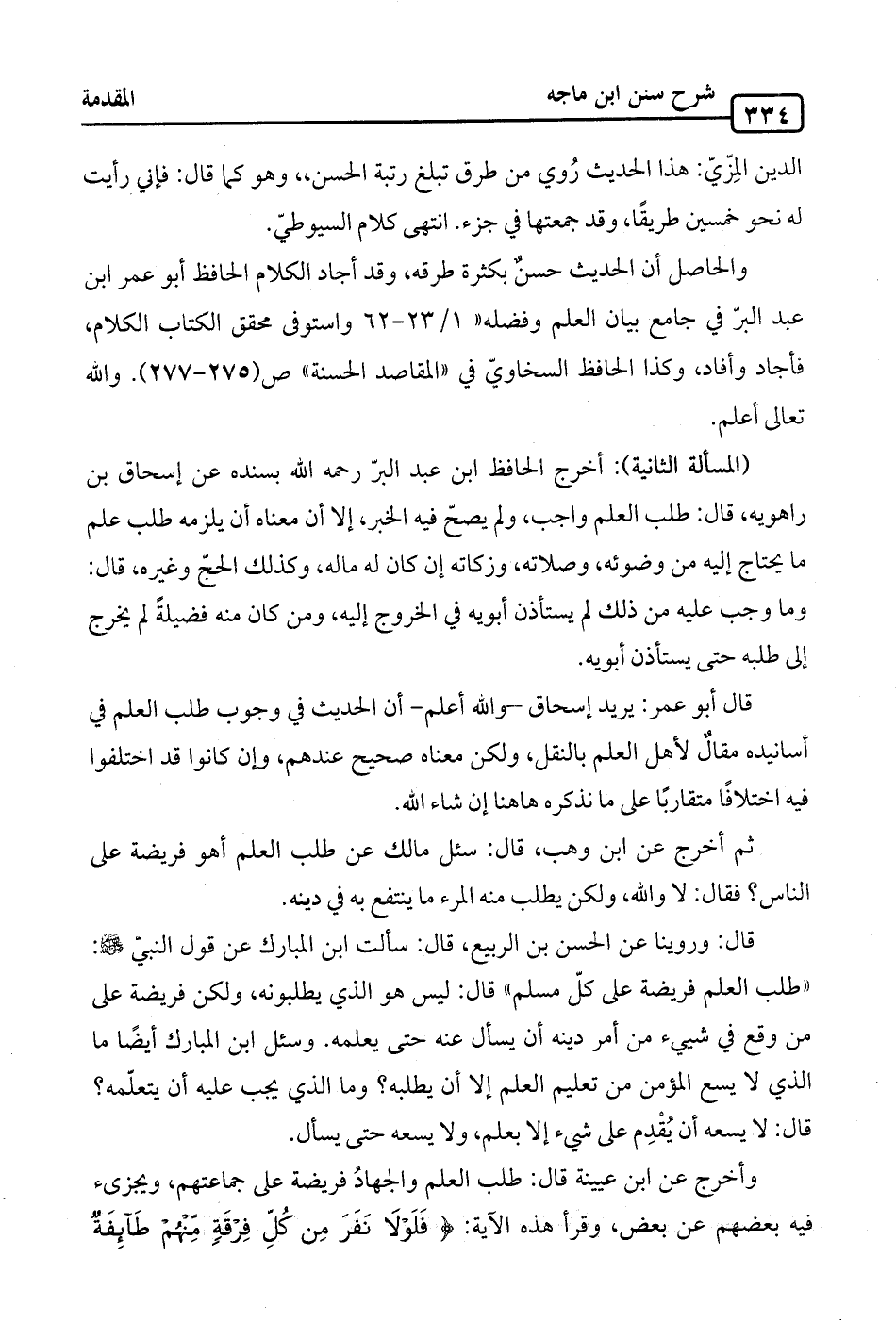 قال أبو عمر: يريد إسحاق -والله أعلم- أن الحديث في وجوب طلب العلم في أسانيده مقالٌ لأهل العلم بالنقل، ولكن معناه صحيح عندهم، وإن كانوا قد اختلفوا فيه اختلافًا متقاربًا على ما نذكره هاهنا إن شاء الله.