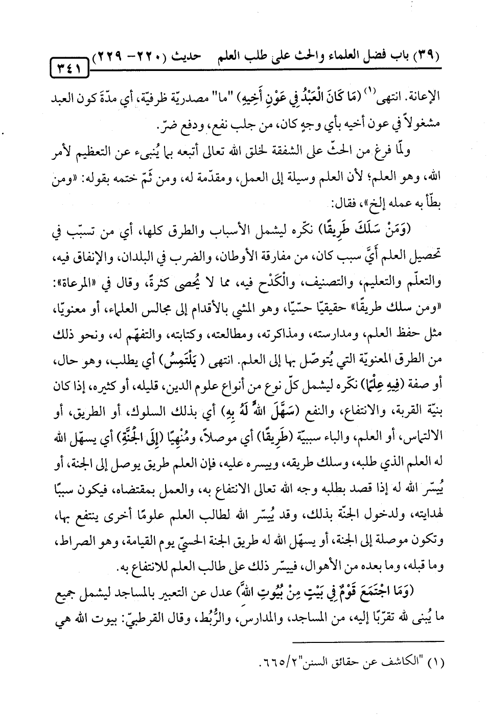 (وَمَنْ سَلَكَ طَرِيقًا) نكّره ليشمل الأسباب والطرق كلها، أي من تسبّب في تحصيل العلم أَيَّ سبب كان، من مفارقة الأوطان، والضرب في البلدان، والإنفاق فيه، والتعلّم والتعليم، والتصنيف، والْكَدْح فيه، مما لا يُحصى كثرةً، وقال في "المرعاة": "ومن سلك طريقًا" حقيقيّا حسيّا، وهو المشي بالأقدام إلى مجالس العلماء، أو معنويّا، مثل حفظ العلم، ومدارسته، ومذاكرته، ومطالعته، وكتابته، والتفهّم له، ونحو ذلك من الطرق المعنويّة التي يُتوصّل بها إلى العلم. انتهى (يَلْتَمِسُ) أي يطلب، وهو حال، أو صفة (فِيهِ عِلْمًا) نكّره ليشمل كل نوع من أنواع علوم الدين، قليله، أو كثيره، إذا كان بنيّة القربة، والانتفاع، والنفع (سَهَّلَ الله لَهُ بِهِ) أي بذلك السلوك، أو الطريق، أو الالتماس، أو العلم، والباء سببيّة (طَرِيقًا) أي موصلًا، ومُنْهِيًا (إِلَى الجنَّةِ) أي يسهّل الله له العلم الذي طلبه، وسلك طريقه، وييسره عليه، فإن العلم طريق يوصل إلى الجنة، أو ييسر الله له إذا قصد بطلبه وجه الله تعالى الانتفاع به، والعمل بمقتضاه، فيكون سببًا لهدايته، ولدخول الجنّة بذلك، وقد يُيسّر الله لطالب العلم علومًا أخرى ينتفع بها، وتكون موصلة إلى الجنة، أو يسهّل الله له طريق الجنة الحسيّ يوم القيامة، وهو الصراط، وما قبله، وما بعده من الأهوال، فييسّر ذلك على طالب العلم للانتفاع به.
