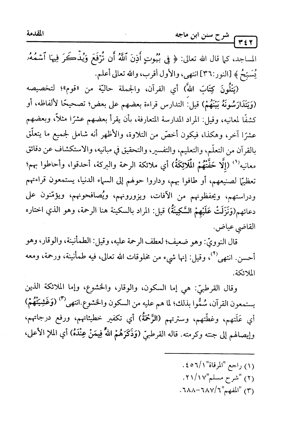 (يتلُونَ كِتَابَ اللَّه) أي القرآن، والجملة حاليّة من "قوم"؛ لتخصيصه (وَيَتَدَارسونَهُ بَينَهُمْ) قيل: التدارس قراءة بعضهم على بعض؛ تصحيحًا لألفاظه، أو كشفًا لمعانيه، وقيل: المراد المدارسة المتعارفة، بأن يقرأ بعضهم عشرا مثلًا، وبعضهم عشرًا آخر، وهكذا، فيكون أخص من التلاوة، والأظهر أنه شامل لجميع ما يتعلّق بالقرآن من التعلم، والتعليم، والتفسير، والتحقيق في مبانيه، والاستكشاف عن دقائق معانيه (¬1) (إِلَّا حَفَّتْهُم الملائِكَةُ) أي ملائكة الرحمة والبركة، أحدقوا، وأحاطوا بهم؛ تعظيمًا لصنيعهم، أو طافوا بهم، وداروا حولهم إلى السماء الدنيا، يستمعون قراءتهم ودراستهم، ويحفظونهم من الآفات، ويزورونهم، ويُصافحونهم، ويؤمّنون على دعائهم (وَنَزَلَت عَلَيْهِم السَّكِينَةُ) قيل: المراد بالسكينة هنا الرحمة، وهو الذي اختاره القاضي عياض.