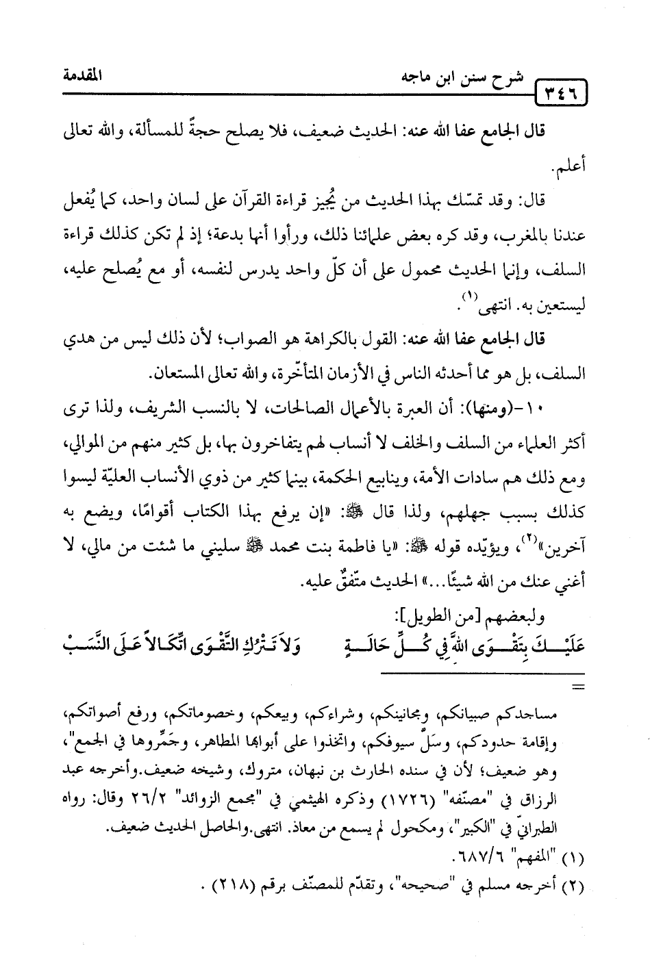 10 - (ومنها): أن العبرة بالأعمال الصالحات، لا بالنسب الشريف، ولذا ترى أكثر العلماء من السلف والخلف لا أنساب لهم يتفاخرون بها، بل كثير منهم من الموالي، ومع ذلك هم سادات الأمة، وينابيع الحكمة، بينما كثير من ذوي الأنساب العليّة ليسوا كذلك بسبب جهلهم، ولذا قال -صلى الله عليه وسلم-: "إن الله يرفع بهذا الكتاب أقوامًا، ويضع به آخرين" (¬2)، ويؤيّده قوله -صلى الله عليه وسلم-: "يا فاطمة بنت محمد -صلى الله عليه وسلم- سليني ما شئت من مالي، لا أغني عنك من الله شيئا. . . ." الحديث متّفقٌ عليه.
