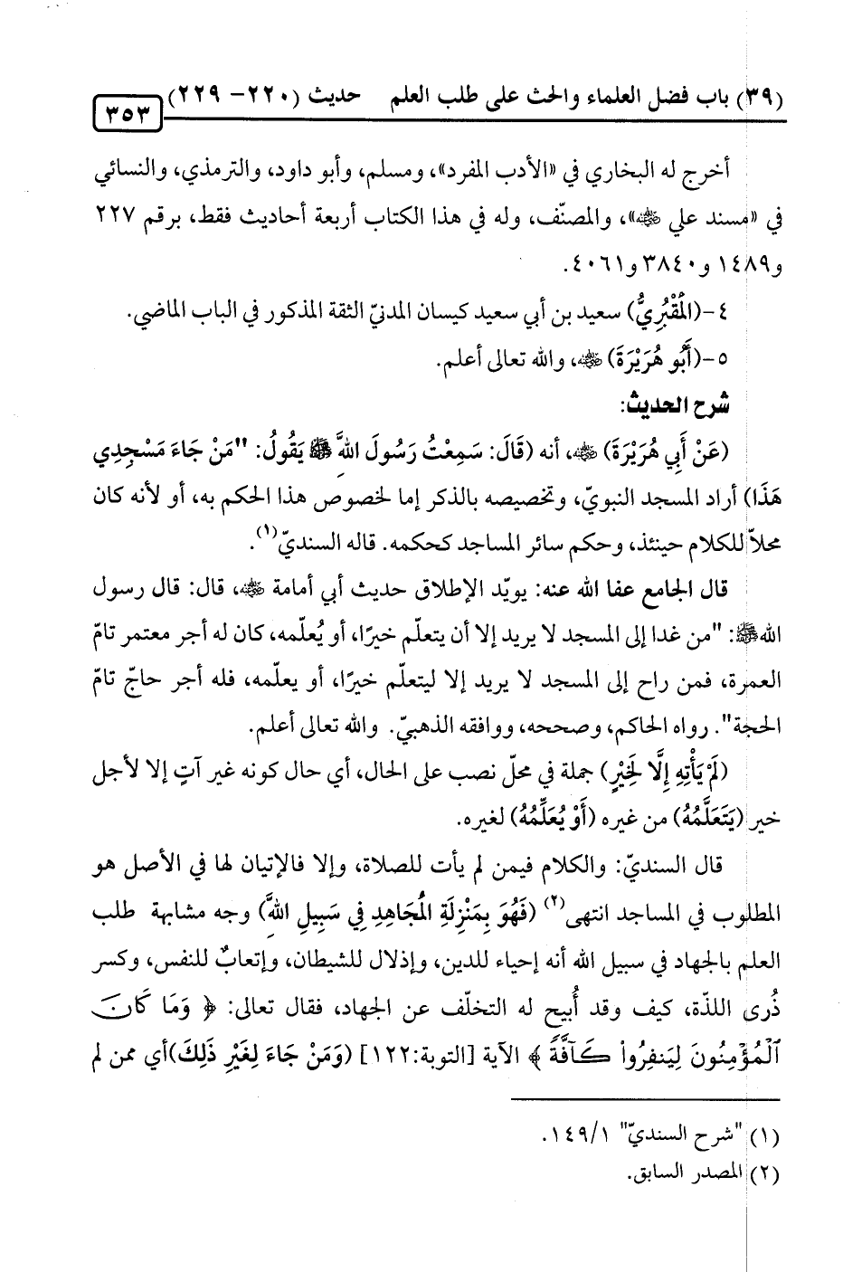 قال الجامع -عفا الله عنه-: يؤيّد الإطلاق حديث أبي أمامة -رضي الله عنه-، قال: قال رسول الله -صلى الله عليه وسلم-: "من غدا إلى المسجد لا يريد إلا أن يتعلّم خيرًا، أو يُعلّمه، كان له أجر معتمر تامّ العمرة، فمن راح إلى المسجد لا يريد إلا ليتعلّم خيرًا، أو يعلّمه، فله أجر حاجّ تامّ الحجة". رواه الحاكم، وصححه، ووافقه الذهبيّ. والله تعالى أعلم.