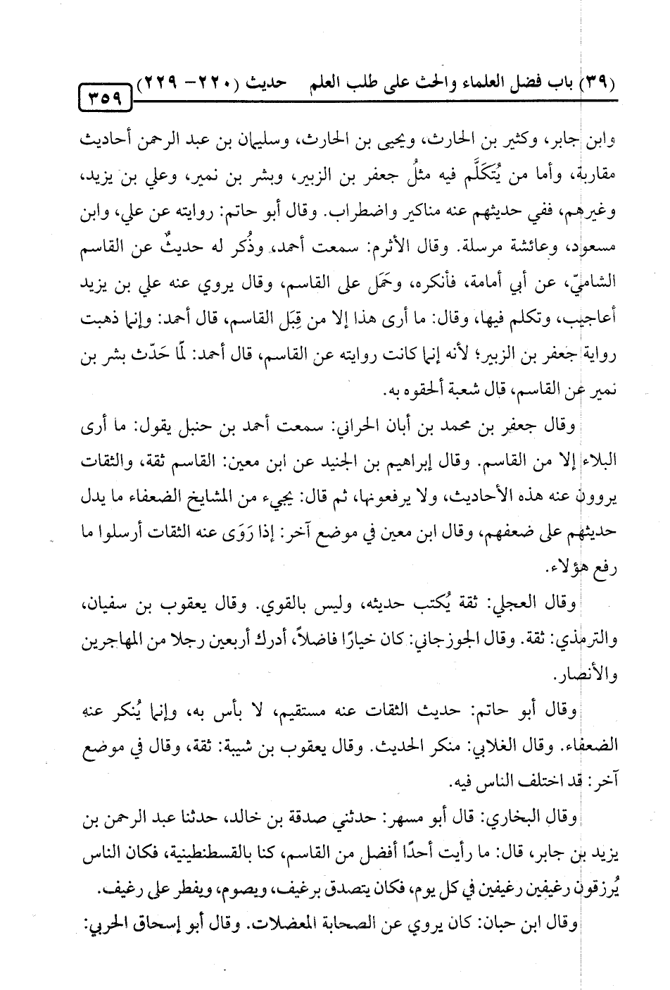 وقال جعفر بن محمد بن أبان الحراني: سمعت أحمد بن حنبل يقول: ما أرى البلاء إلا من القاسم. وقال إبراهيم بن الجنيد عن ابن معين: القاسم ثقة، والثقات يروون عنه هذه الأحاديث، ولا يرفعونها، ثم قال: يجيء من المشايخ الضعفاء ما يدل حديثهم على ضعفهم، وقال ابن معين في موضع آخر: إذا رَوى عنه الثقات أرسلوا ما رفع هؤلاء.