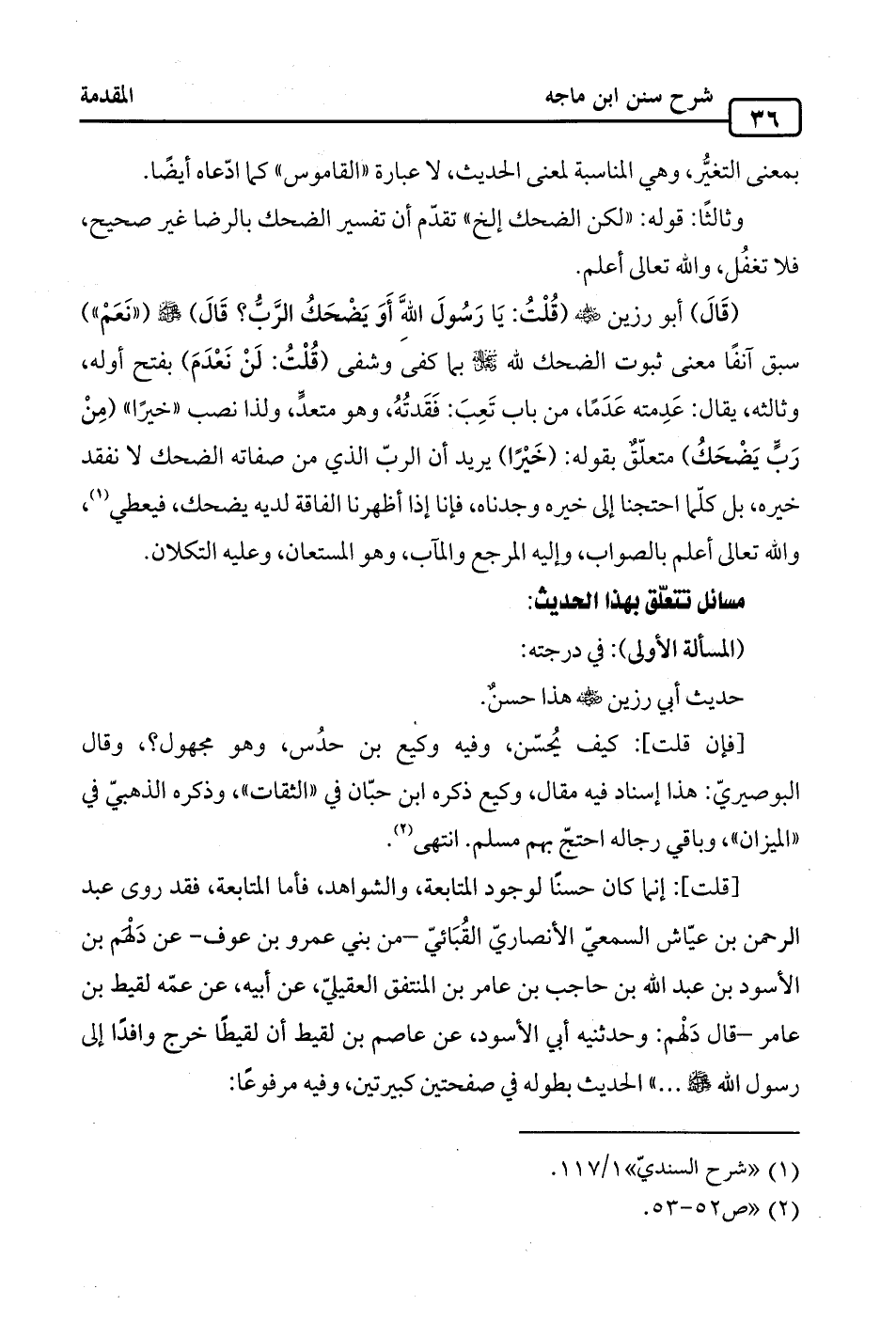 (قَالَ) أبو رزين -رضي الله عنه- (قُلْتُ: يَا رَسُولَ الله أَوَ يَضْحَكُ الرَّبُّ؟ قَالَ) - صلّى الله عليه وسلم - "نَعَمْ") سبق آنفًا معنى ثبوت الضحك لله -عَزَّ وَجَلَّ- بنا كفى وشفى (قُلْتُ: لَنْ نَعْدَمَ) بفتح أوله، وثالثه، يقال: عَدِمته عَدَمًا، من باب تَعِبَ: فَقَدتُهُ، وهو متعدًّ، ولذا نصب "خيرًا" (مِنْ رَبٍّ يَضْحَكُ) متعلّقٌ بقوله: (خَيْرًا) يريد أن الربّ الّذي من صفاته الضحك لا نفقد خيره، بل كلّما احتجنا إلى خيره وجدناه، فإنا إذا أظهرنا الفاقة لديه يضحك، فيعطي (¬1)، والله تعالى أعلم بالصواب، وإليه المرجع والمآب، وهو المستعان، وعليه التكلان.