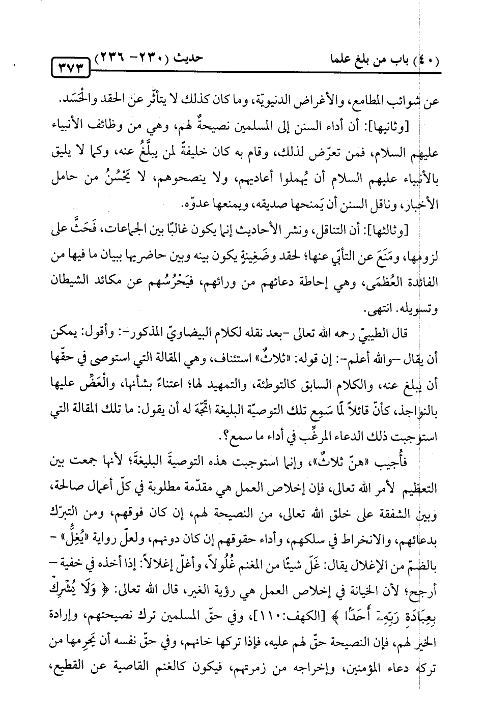 [وثانيها]: أن أداء السنن إلى المسلمين نصيحةٌ لهم، وهي من وظائف الأنبياء -عليهم السلام-، فمن تعرّض لذلك، وقام به كان خليفةً لمن يبلَّغُ عنه، وكما لا يليق بالأنبياء -عليهم السلام- أن يُهملوا أعاديهم، ولا ينصحوهم، لا يَحْسُنُ من حامل الأخبار، وناقل السنن أن يَمنحها صديقه، ويمنعها عدوّه.