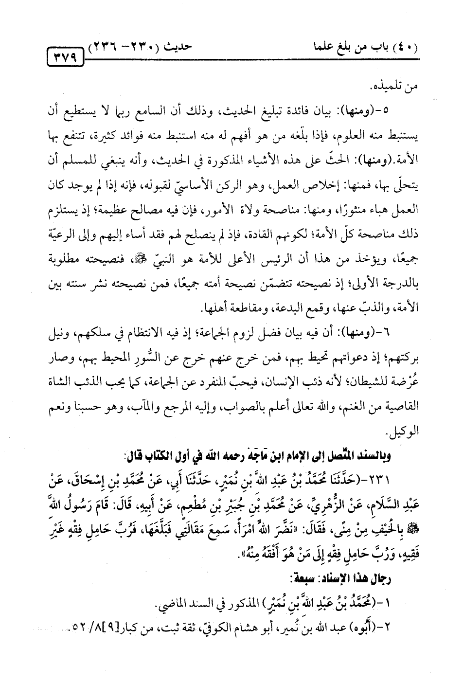 231 - (حَدَّثَنَا مُحَمَّدُ بْنُ عَبْدِ اللَّهِ بْنِ نُمَيْرٍ، حَدَّثَنَا أَبِي، عَنْ مُحَمَّدِ بْنِ إِسْحَاقَ، عَنْ عَبْدِ السَّلَامِ، عَنِ الزُّهْرِيِّ، عَنْ مُحَمَّدِ بْنِ جُبَيْرِ بْنِ مُطْعِمٍ، عَنْ أَبِيهِ، قَالَ: قَامَ رَسُولُ اللَّهِ -صَلَّى اللهُ عَلَيْهِ وَسَلَّمَ- بِالْخَيْفِ مِنْ مِنًى، فَقَالَ: "نَضَّرَ اللَّهُ امْرَأً سَمِعَ مَقَالَتِي فَبَلَّغَهَا، فَرُبَّ حَامِلِ فِقْهٍ غَيْرِ فَقِيهٍ، وَرُبَّ حَامِلِ فِقْهٍ إِلَى مَنْ هُوَ أَفْقَهُ مِنْهُ".