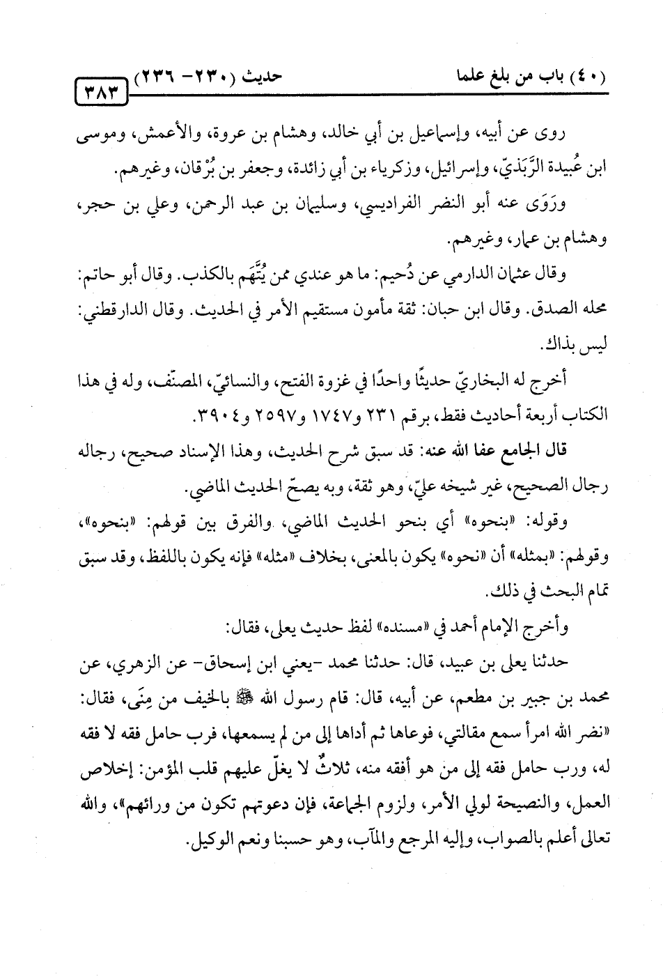 حدثنا يعلى بن عبيد، قال: حدثنا محمد -يعني ابن إسحاق- عن الزهري، عن محمد بن جبير بن مطعم، عن أبيه، قال: قام رسول الله -صلى الله عليه وسلم- بالخيف من مِنَى، فقال: "نضر الله امرأ سمع مقالتي، فوعاها ثم أداها إلى من لم يسمعها، فرب حامل فقه لا فقه له، ورب حامل فقه إلى من هو أفقه منه، ثلاث لا يغلّ عليهم قلب المؤمن: إخلاص العمل، والنصيحة لولي الأمر، ولزوم الجماعة، فإن دعوتهم تكون من ورائهم"، والله تعالى أعلم بالصواب، وإليه المرجع والمآب، وهو حسبنا ونعم الوكيل.