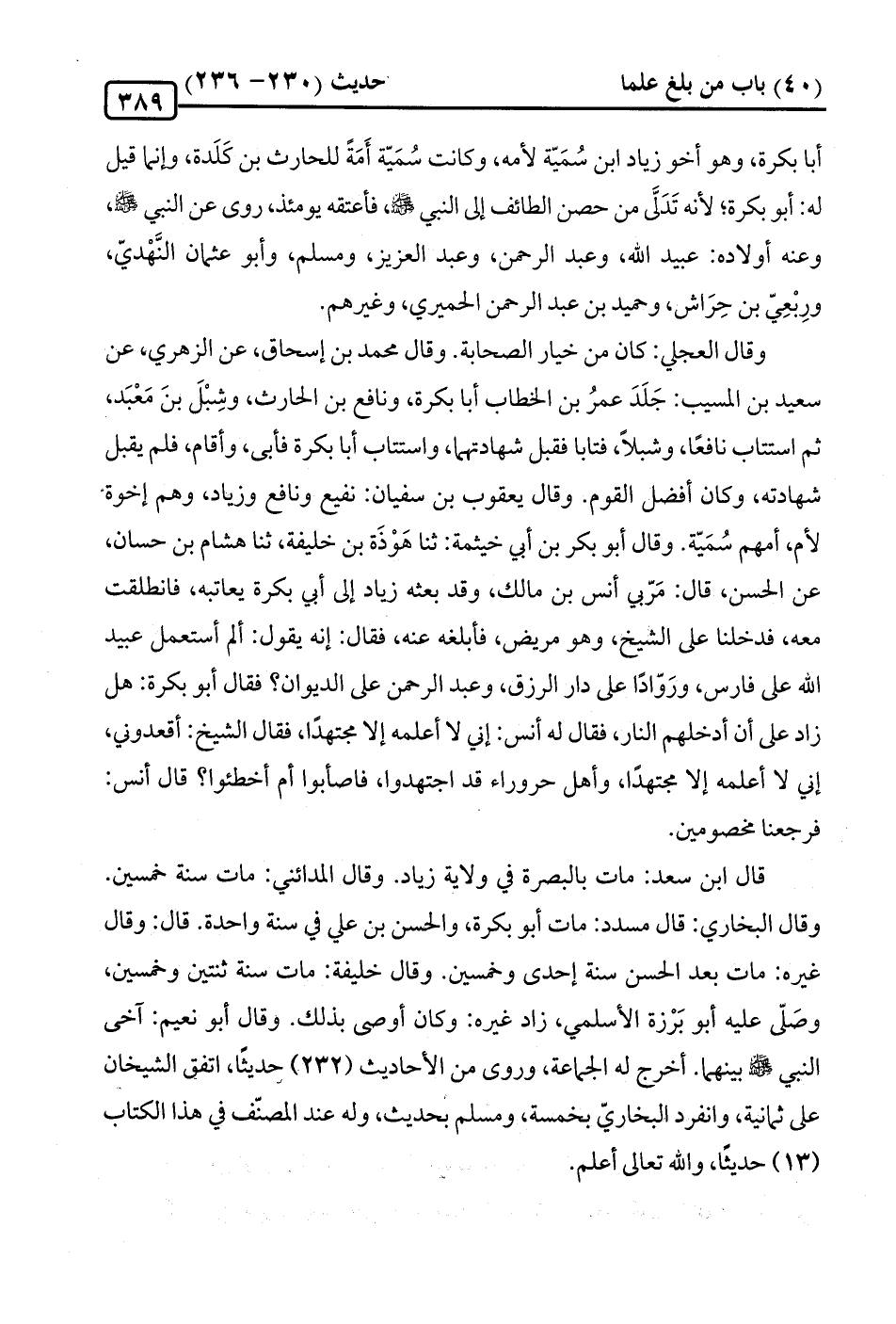 وقال البخاري: قال مسدد: مات أبو بكرة، والحسن بن علي في سنة واحدة. قال: وقال غيره: مات بعد الحسن سنة إحدى وخمسين. وقال خليفة: مات سنة ثنتين وخمسين، وصَلّى عليه أبو بَرْزة الأسلمي، زاد غيره: وكان أوصى بذلك. وقال أبو نعيم: آخى النبي -صلى الله عليه وسلم- بينهما. أخرج له الجماعة، وروى من الأحاديث (232) حديثًا، اتفق الشيخان على ثمانية، وانفرد البخاريّ بخمسة، ومسلم بحديث، وله عند المصنّف في هذا الكتاب (13) حديثًا، والله تعالى أعلم.