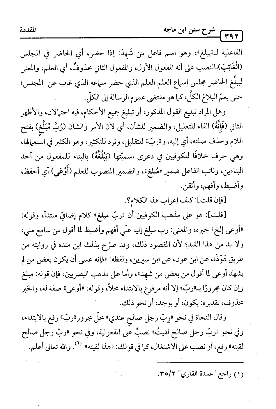 وهل المراد تبليغ القول المذكور، أو تبليغ جميع الأحكام، فيه احتمالان، والأظهر الثاني (فَإِنَّهُ) الفاء للتعليل، والضمير للشأن، أي لأن الأمر والشأن (رُبَّ مُبَلَّغٍ) بفتح اللام وحذف صلته، أي إليه، و"ربّ" للتقليل، وترد للتكثير، وهو الكثير في استعمالها، وهي حرف خلافًا للكوفيين في دعوى أسميّتها (يَبْلُغُهُ) بالبناء للمفعول من أحد البناءين، ونائب الفاعل ضمير "مُبلغ"، والضمير المنصوب للعلم (أوْعَى) أي أحفظ، وأضبط، وأفهم، وأتقن.