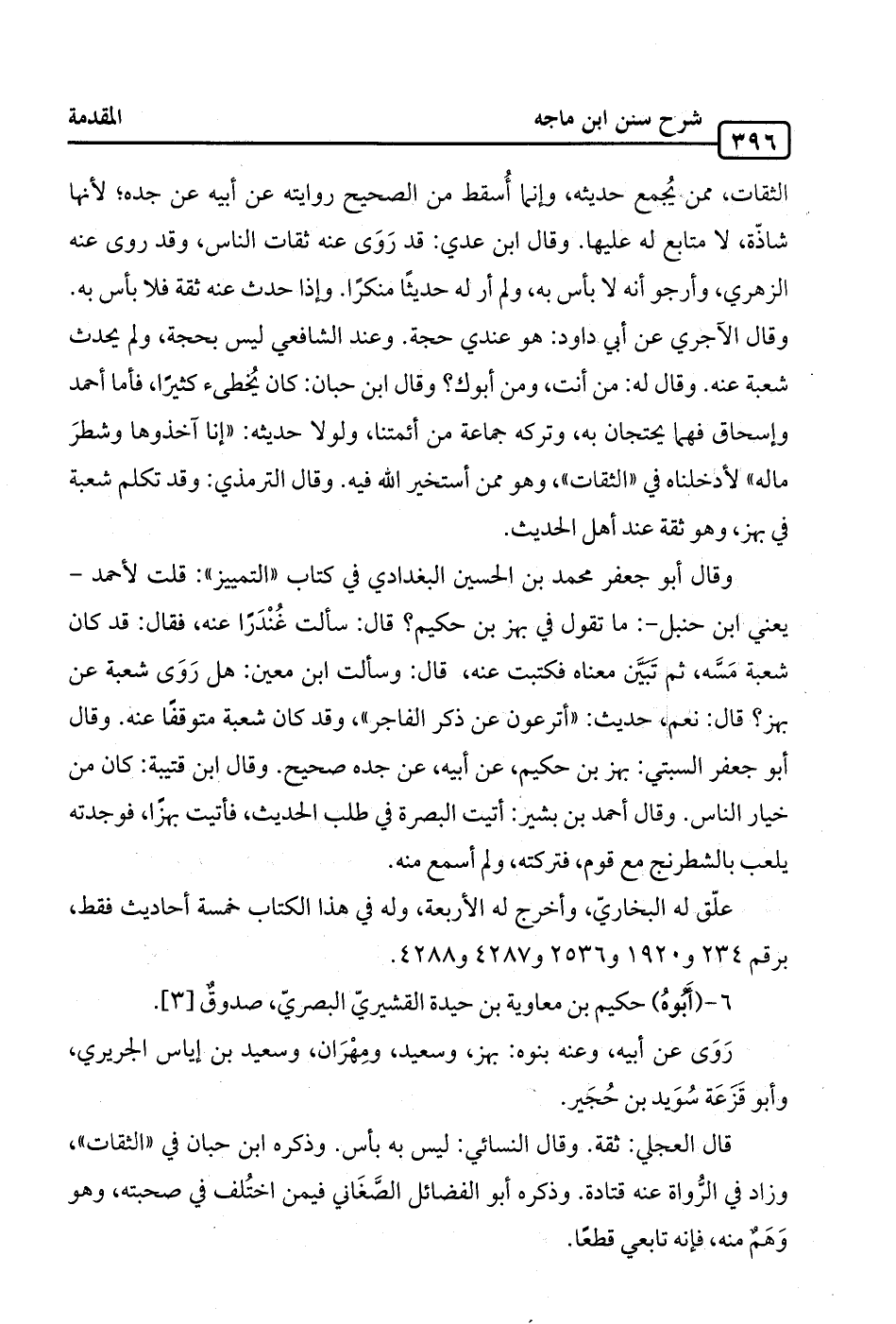 الثقات، ممن يُجمع حديثه، وإنما أُسقط من الصحيح روايته عن أبيه عن جده؛ لأنها شاذّة، لا متابع له عليها. وقال ابن عدي: قد رَوَى عنه ثقات الناس، وقد روى عنه الزهري، وأرجو أنه لا بأس به، ولم أر له حديثًا منكرًا. وإذا حدث عنه ثقة فلا بأس به. وقال الآجري عن أبي داود: هو عندي حجة. وعند الشافعي ليس بحجة، ولم يحدث شعبة عنه. وقال له: من أنت، ومن أبوك؟ وقال ابن حبان: كان يُخطىء كثيرًا، فأما أحمد وإسحاق فهما يحتجان به، وتركه جماعة من أئمتنا، ولولا حديثه: "إنا آخذوها وشطرَ ماله" لأدخلناه في "الثقات"، وهو ممن أستخير الله فيه. وقال الترمذي: وقد تكلم شعبة في بهز، وهو ثقة عند أهل الحديث.