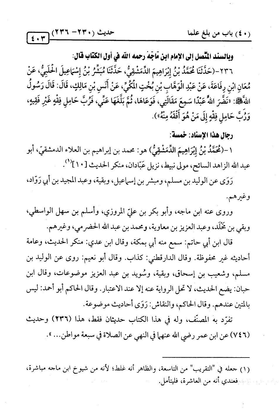 236 - (حَدَّثَنَا مُحَمَّدُ بْنُ إِبْرَاهِيمَ الدِّمَشْقِيُّ، حَدَّثَنَا مُبَشِّرُ بْنُ إِسماعيلَ الحلَبِيُّ، عَنْ مُعَانِ ابْنِ رِفَاعَةَ، عَنْ عَبْدِ الْوَهَّابِ بْنِ بُخْتٍ المكِّيِّ، عَنْ أَنَسِ بْنِ مَالِكٍ، قَالَ: قَالَ رَسُولُ الله -صلى الله عليه وسلم-: "نَضَّرَ الله عَبْدًا سَمِعَ مَقَالَتِي، فَوعَاهَا، ثُمَّ بَلَّغَهَا عَنِّي، فَرُبَّ حَامِلِ فِقهٍ غَيْرِ فَقِيهٍ، وَرُبَّ حَامِلِ فِقهٍ إِلَى مَن هُوَ أَفقَهُ مِنْهُ").