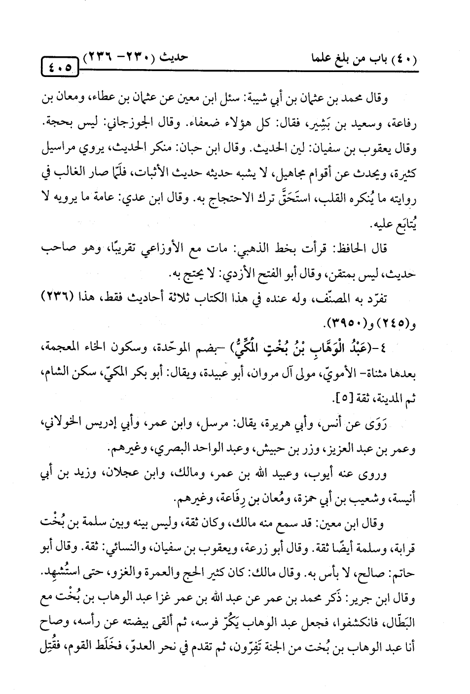 4 - (عَبْدُ الْوَهَّابِ بْنُ بُخْتٍ المكِّيُّ) -بضم الموحّدة، وسكون الخاء المعجمة، بعدها مثناة- الأمويّ، مولى آل مروان، أبو عبيدة، ويقال: أبو بكر المكيّ، سكن الشام، ثم المدينة، ثقة [5].