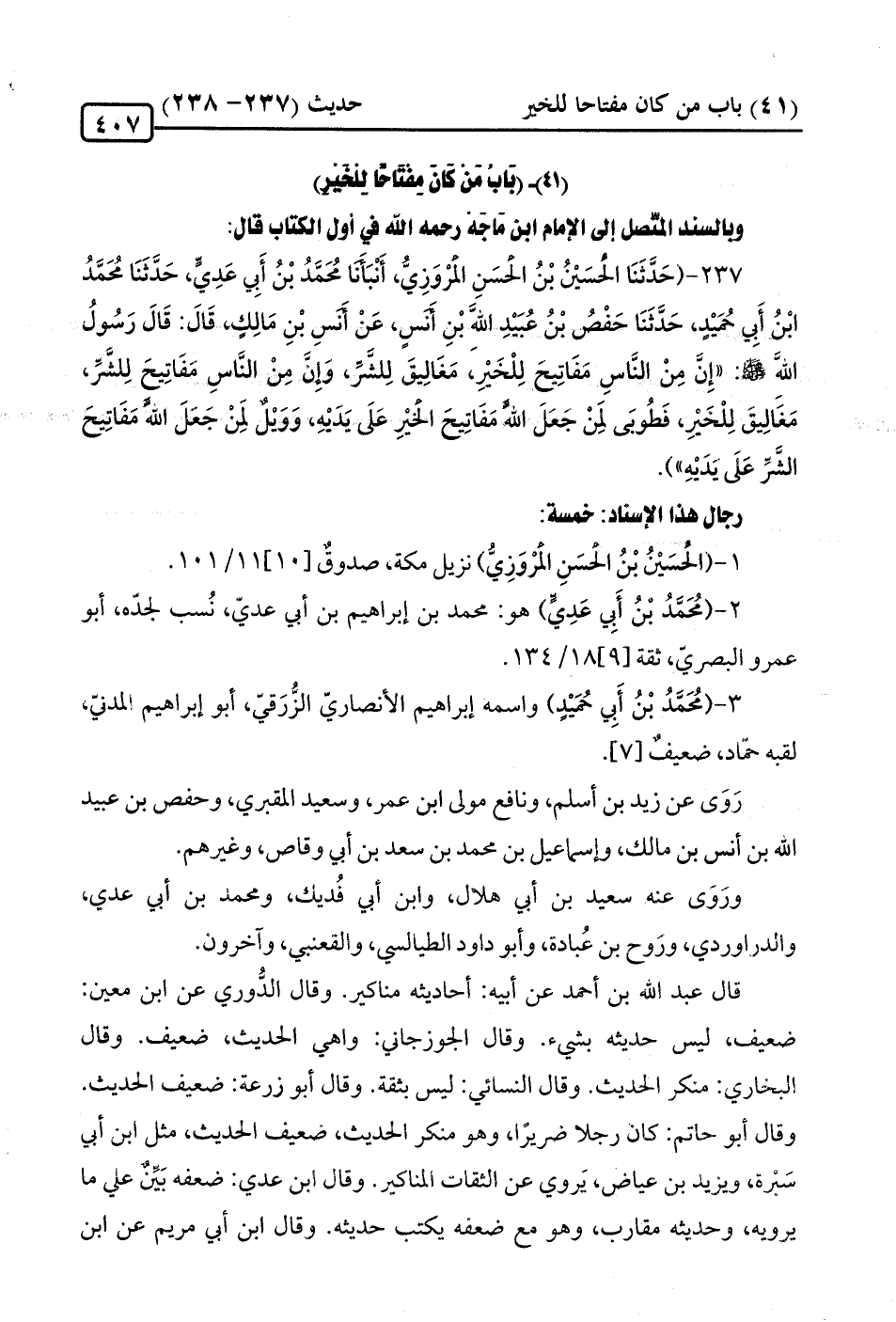 237 - (حَدَّثَنَا الحُسَينُ بْنُ الحسَنِ الْمرْوَزِيُّ، أَنْبَأَنَا مُحَمَّدُ بن أَبِي عَدِيٍّ، حَدَّثَنَا مُحَمَّدُ ابْنُ أَبِي حُمَيْدٍ، حَدَّثَنَا حَفْصُ بْنُ عُبَيْدِ الله بْنِ أَنَسٍ، عَنْ أَنَسِ بْنِ مَالِكٍ، قَالَ: قَالَ رَسُولُ الله -صلى الله عليه وسلم-: "إنَّ مِنْ النَّاسِ مَفَاتِيحَ لِلْخَيْرِ، مَغَالِيقَ لِلشَّرِّ، وَإِنَّ مِنْ النَّاسِ مَفَاتِيحَ لِلشَّرِّ، مَغَالِيقَ لِلْخَيْرِ، فَطُوبَى لمِنْ جَعَلَ الله مَفَاتِيحَ الخَيْرِ عَلَى يَدَيْهِ، وَوَيْلٌ لمِن جَعَلَ الله مَفَاتِيحَ الشَّرِّ عَلَى يَدَيْهِ").