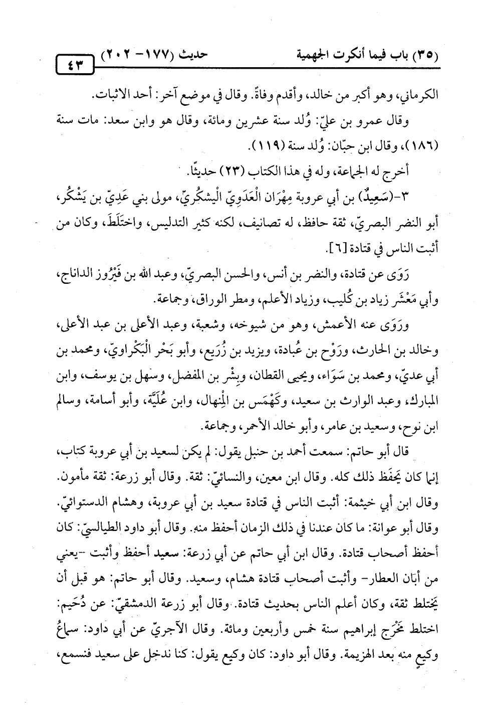 3 - (سَعِيدٌ) بن أبي عروبة مِهْرَان الْعَدَويّ الْيشكُريّ، مولى بني عَدِيّ بن يَشْكُر، أبو النضر البصريّ، ثقة حافظ، له تصانيف، لكنه كثير التدليس، واختَلَطَ، وكان من أثبت النَّاس في قتادة [6].