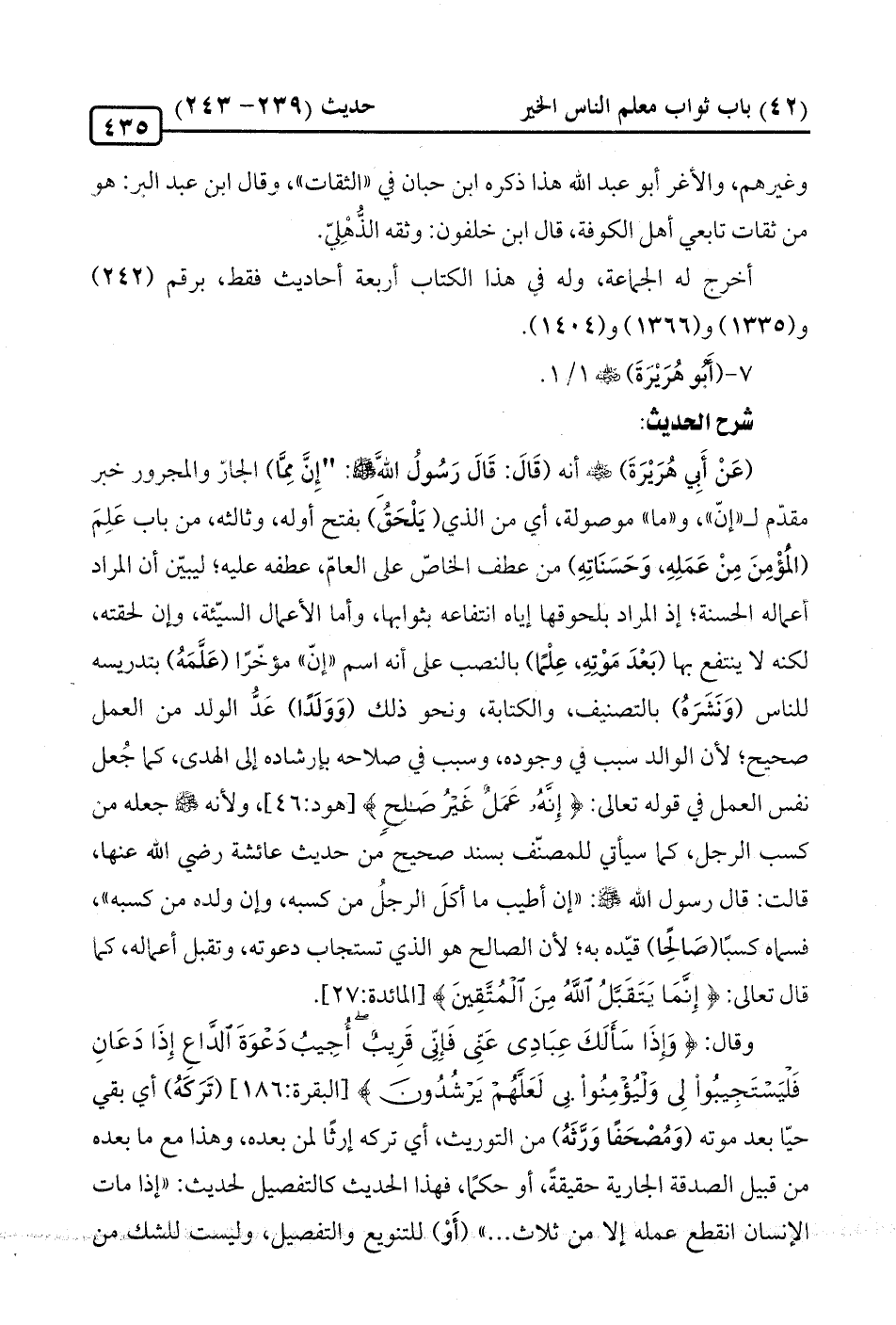 (عَنْ أَبِي هُرَيْرَةَ) -رضي الله عنه- أنه (قَالَ: قَالَ رَسُولُ الله -صلى الله عليه وسلم-: "إِنَّ مِمَّا) الجارّ والمجرور خبر مقدّم لـ"إنّ"، و"ما" موصولة، أي من الذي (يَلْحَقُ) بفتح أوله، وثالثه، من باب عَلِمَ (المُؤْمِنَ مِنْ عَمَلِهِ، وَحَسَنَاتِهِ) من عطف الخاصّ على العامّ، عطفه عليه؛ ليبيّن أن المراد أعماله الحسنة؛ إذ المراد بلحوقها إياه انتفاعه بثوابها، وأما الأعمال السيّئة، وإن لحقته، لكنه لا ينتفع بها (بَعْدَ مَوْتِهِ، عِلْمًا) بالنصب على أنه اسم "إنّ " مؤخّرًا (عَلَّمَهُ) بتدريسه للناس (وَنَشَرَهُ) بالتصنيف، والكتابة، ونحو ذلك (وَوَلَدًا) عَدُّ الولد من العمل صحيح؛ لأن الوالد سبب في وجوده، وسبب في صلاحه بإرشاده إلى الهدى، كما جُعل نفس العمل في قوله تعالى: {إِنَّهُ عَمَلٌ غَيْرُ صَالِحٍ} [هود: 46]، ولأنه -صلى الله عليه وسلم- جعله من كسب الرجل، كما سيأتي للمصنّف بسند صحيح من حديث عائشة رضي الله عنها، قالت: قال رسول الله -صلى الله عليه وسلم-: "إن أطيب ما أكلَ الرجلُ من كسبه، وإن ولده من كسبه"، فسماه كسبًا (صَالِحًا) قيّده به؛ لأن الصالح هو الذي تستجاب دعوته، وتقبل أعماله، كما قال تعالى: {إِنَّمَا يَتَقَبَّلُ اللَّهُ مِنَ الْمُتَّقِينَ} [المائدة: 27]. وقَال: {وَإِذَا سَأَلَكَ عِبَادِي عَنِّي فَإِنِّي قَرِيبٌ أُجِيبُ دَعْوَةَ الدَّاعِ إِذَا دَعَانِ فَلْيَسْتَجِيبُوا لِي وَلْيُؤْمِنُوا بِي لَعَلَّهُمْ يَرْشُدُونَ} [البقرة: 186] (تَرَكَهُ) أي بقي حيّا بعد موته (وَمُصْحَفًا وَرَّثَهُ) من التوريث، أي تركه إرثًا لمن بعده، وهذا مع ما بعده من قبيل الصدقة الجارية حقيقةً، أو حكمًا، فهذا الحديث كالتفصيل لحديث: "إذا مات الإنسان انقطع عمله إلا من ثلاث. . ." (أَوْ) للتنويع والتفصيل، وليست للشك من