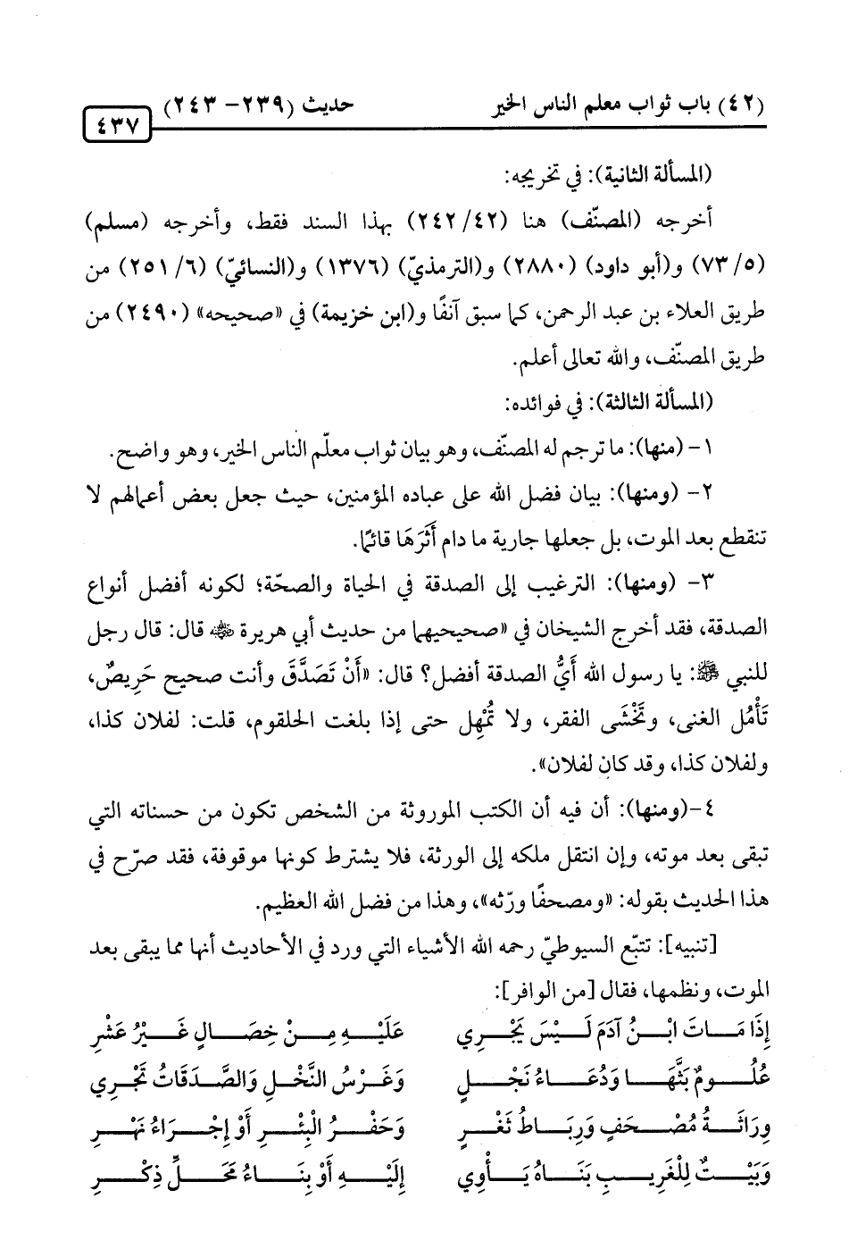 عُلُومٌ بَثَّهَا وَدُعَاءُ نَجْلٍ ... وَغَرْسُ النَّخْلِ وَالصَّدَقَاتُ تَجْرِي