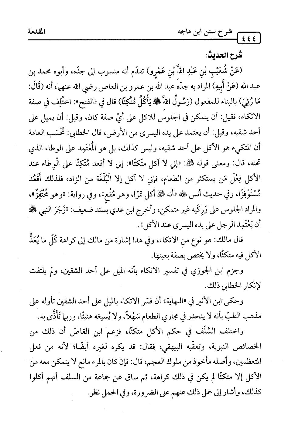 وحكى ابن الأثير في "النهاية" أن فسّر الاتكاء بالميل على أحد الشقين تأوله على مذهب الطبّ بأنه لا ينحدر في مجاري الطعام سَهْلًا، ولا يُسيغه هنيئًا، وربما تَأَذَّى به.