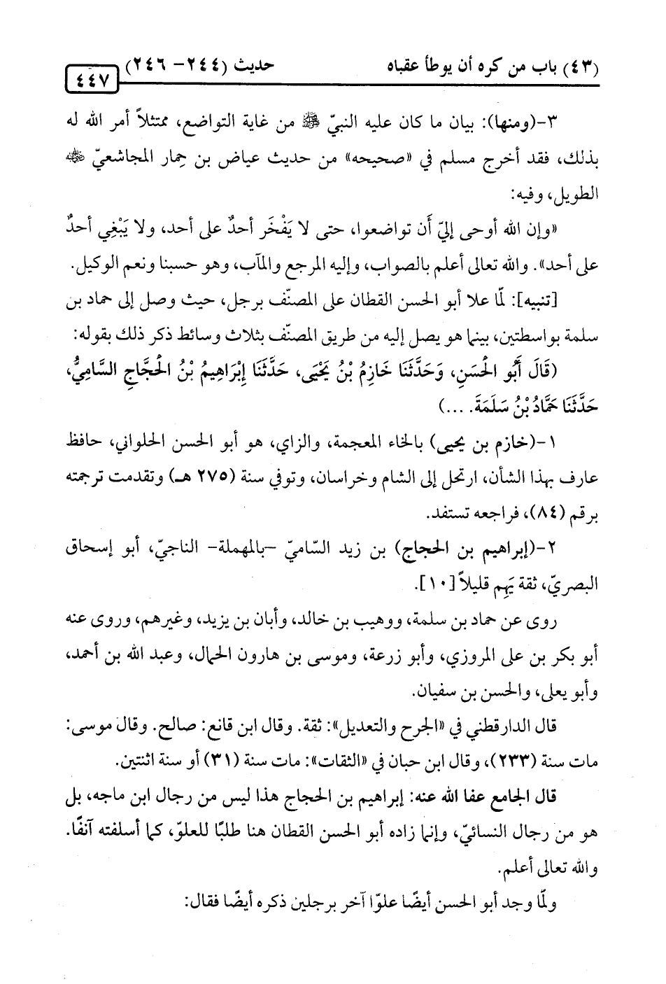 [تنبيه]: لمّا علا أبو الحسن القطان على المصنّف برجل، حيث وصل إلى حماد بن سلمة بواسطتين، بينما هو يصل إليه من طريق المصنّف بثلاث وسائط ذكر ذلك بقوله: (قَالَ أَبُو الحسَنِ، وَحَدَّثَنَا خَازِمُ بْنُ يَحْيَى، حَدَّثَنَا إِبْرَاهِيمُ بْنُ الحجَّاجِ السَّامِيُّ، حَدَّثَنَا حَمَّادُ بْنُ سَلَمَةَ. . . .)