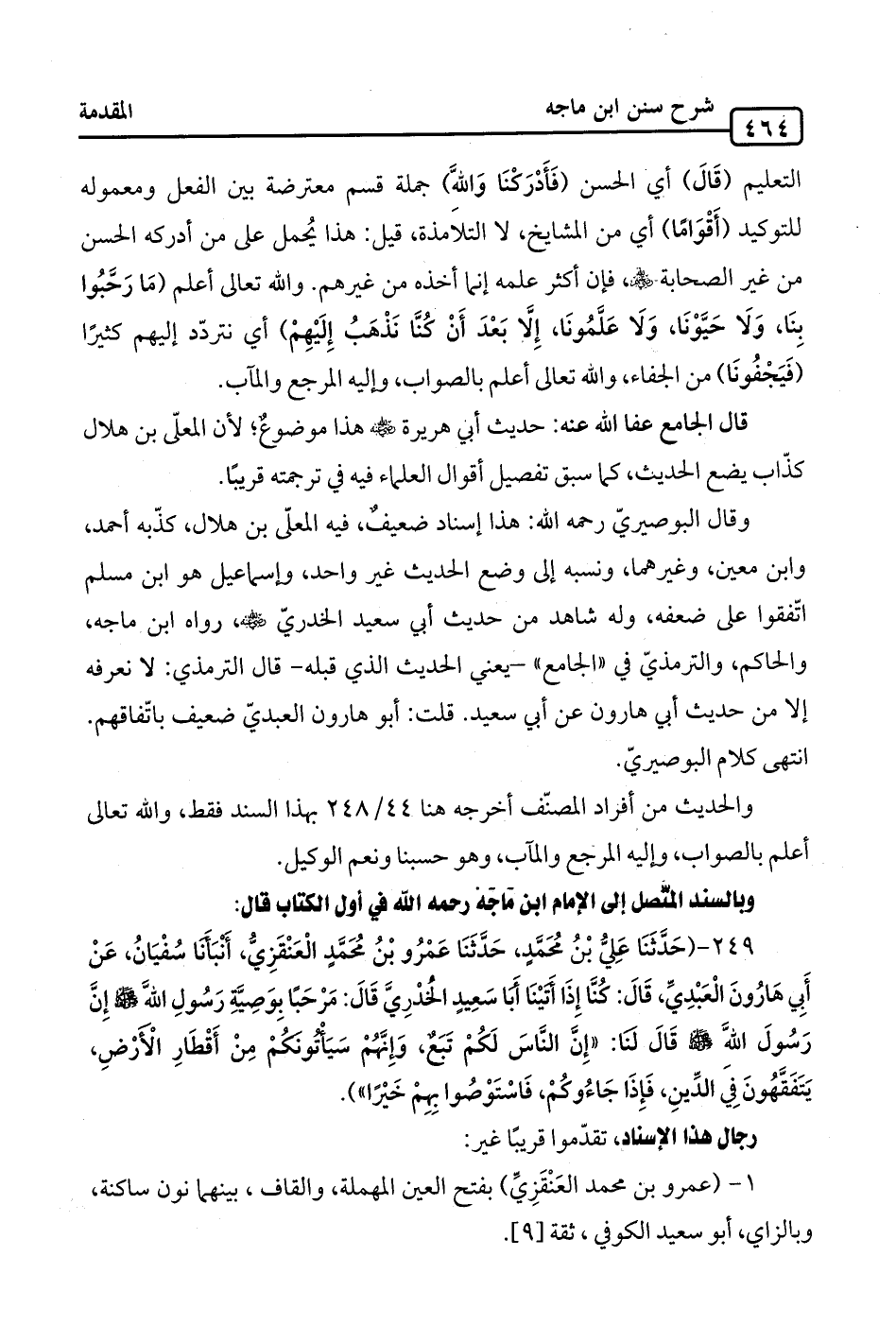 249 - (حَدَّثَنَا عَليُّ بْنُ مُحَمَّدٍ، حَدَّثَنَا عَمْرُو بْنُ مُحَمَّدٍ الْعَنْقَزِيُّ، أنبَأَنا سُفْيَانُ، عَنْ أَبِي هَارُونَ الْعَبْدِيِّ، قَالَ: كُنَّا إِذَا أَتَيْنَا أَبَا سَعِيدٍ الخُدْرِيَّ قَالَ: مَرْحَبًا بِوَصِيَّةِ رَسُولِ الله -صلى الله عليه وسلم- إِن رَسُولَ الله -صلى الله عليه وسلم- قَالَ لنَا: "إِنَّ النَّاسَ لَكُمْ تَبَعٌ، وَإِنَّهُمْ سَيَأْتُونكُمْ مِنْ أَقْطَارِ الْأَرْضِ، يَتَفَقَّهُونَ فِي الدِّينِ، فَإِذَا جَاءُوكُمْ، فَاسْتَوْصُوا بِهِمْ خَيْرًا").