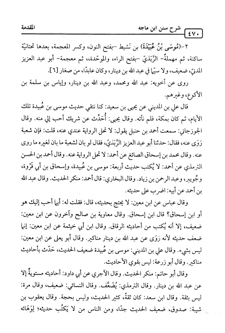 2 - (مُوسَى بْنُ عُبَيْدَةَ) بن نَشيط -بفتح النون، وكسر المعجمة، بعدها تحتانيّة ساكنة، ثم مهملةٌ- الرَّبَذيّ -بفتح الراء، والموحّدة، ثم معجمة- أبو عبد العزيز المدنيّ، ضعيف، ولا سيّما في عبد الله بن دينار، وكان عابدًا، من صغار [6].