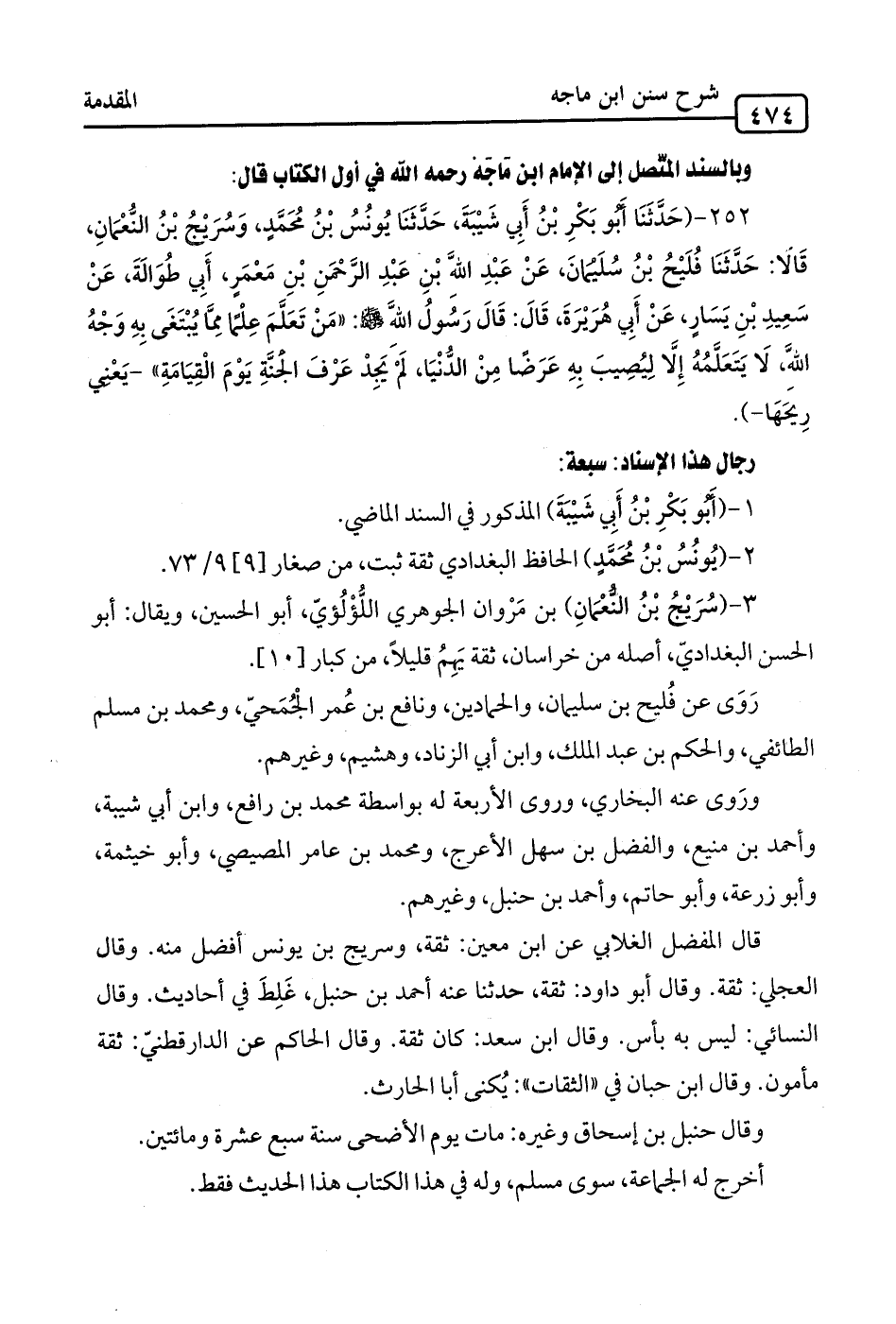 252 - (حَدَّثَنَا أَبُو بَكْرِ بْنُ أَبِي شَيْبَةَ، حَدَّثَنَا يُونُسُ بْنُ مُحَمَّدٍ، وَسُرَيْجُ بْنُ النُّعْمَانِ، قَالا: حَدَّثَنَا فُلَيْحُ بْنُ سُلَيْمانَ، عَنْ عَبْدِ الله بْنِ عَبْدِ الرَّحْمَنِ بْنِ مَعْمَرٍ، أَبِي طُوَالَةَ، عَنْ سَعِيدِ بْنِ يَسَارٍ، عَنْ أَبِي هُرَيْرَةَ، قَالَ: قَالَ رَسُولُ الله -صلى الله عليه وسلم-: "مَنْ تَعَلَّمَ عِلْمًا مِمَّا يُبْتَغَى بِهِ وَجْهُ الله، لَا يَتَعَلَّمُهُ إِلا لِيُصيبَ بِهِ عَرَضًا مِنْ الدُّنْيَا، لَم يَجِدْ عَرْفَ الجنَّةِ يَوْمَ الْقِيَامَةِ" -يَعْني رِيحَهَا-).