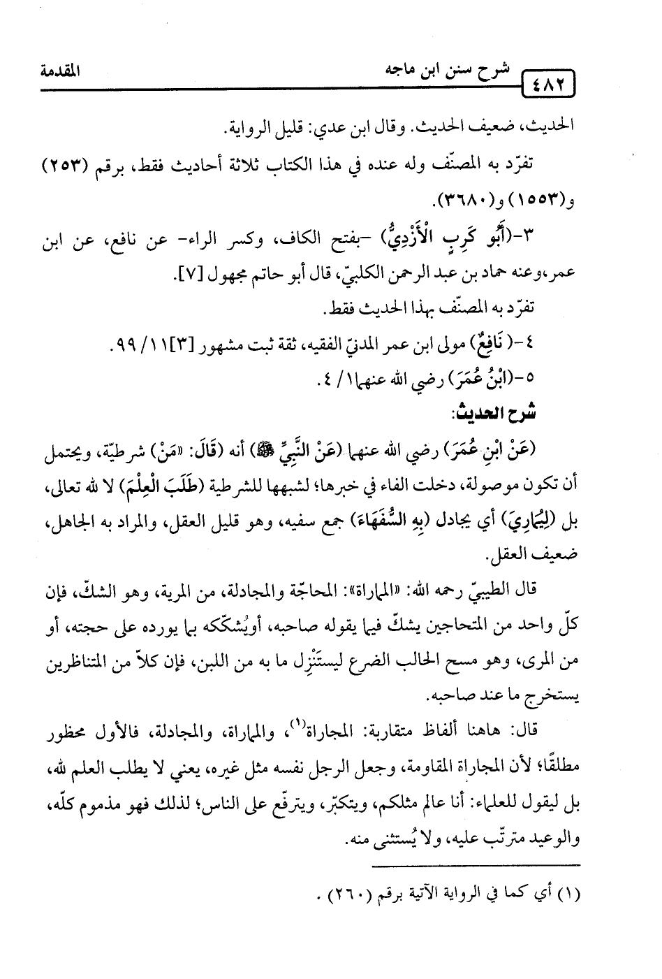 قال: هاهنا ألفاظ متقاربة: المجاراة (¬1)، والمماراة، والمجادلة، فالأول محظور مطلقًا؛ لأن المجاراة المقاومة، وجعل الرجل نفسه مثل غيره، يعني لا يطلب العلم لله، بل ليقول للعلماء: أنا عالم مثلكم، ويتكبّر، ويترفّع على الناس؛ لذلك فهو مذموم كلّه، والوعيد مترتّب عليه، ولا يُستثنى منه.