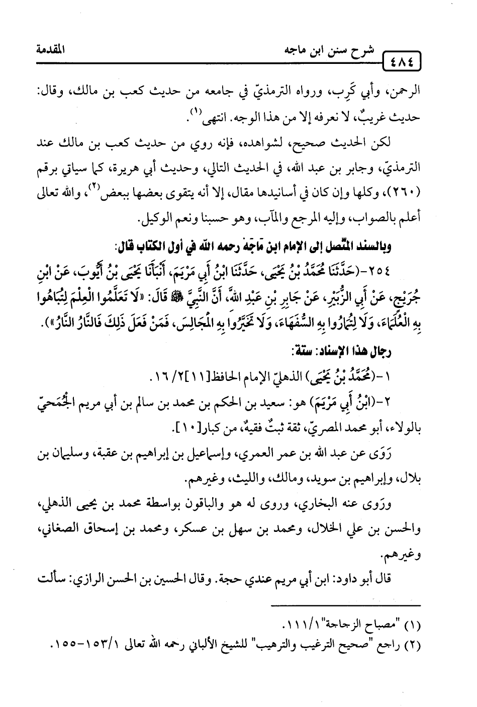 254 - (حَدَّثَنَا مُحَمَّدُ بْنُ يَحْيَى، حَدَّثَنَا ابْنُ أَبِي مَرْيَمَ، أَنبَأَنا يَحْيَى بْنُ أَيُوبَ، عَنْ ابْنِ جُرَيْجٍ، عَنْ أَبِي الزُّبَيْرِ، عَنْ جَابِرِ بْنِ عَبْدِ الله، أَنَّ النَّبِيَّ -صلى الله عليه وسلم- قَالَ: "لَا تَعَلَّمُوا الْعِلْمَ لِتُبَاهُوا بِهِ الْعُلَمَاءَ، وَلَا لِتُمَارُوا بِهِ السُّفَهَاءَ، وَلَا تخَيَّرُوَا بِهِ الْمجَالِسَ، فَمَنْ فَعَلَ ذَلِكَ فَالنَّارُ النَّارُ").