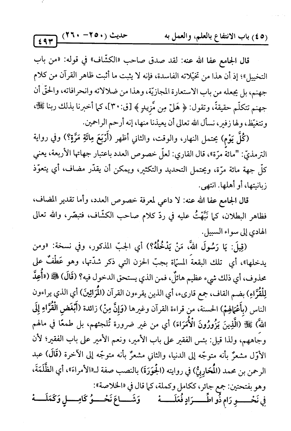 (قِيلَ: يَا رَسُولَ الله، مَنْ يَدْخُلُهُ؟) أي الجبّ المذكور، وفي نسخة: "ومن يدخلها"، أي تلك البقعةَ المسمّاة بجبّ الحزن التي ذكر شدّتها، وهو عَطْفٌ على محذوف، أي ذلك شيء عظيم هائلٌ، فمن الذي يستحق الدخول فيه؟ (قَالَ) -صلى الله عليه وسلم- ("أُعِدَّ لِلْقُرَّاءِ) بضم القاف، جمع قارىء، أي الذين يقرءون القرآن (المُرَائِينَ) أي الذي يراءون الناس (بِأَعْمَالهِمْ) الحسنة، من قراءة القرآن وغيرها (وَإِنَّ مِنْ) زائدة (أَبْغَضِ الْقُرَّاءِ إِلَى اللهِ) سبحانه وتعالى (الَّذِينَ يَزُورُونَ الْأُمَرَاءَ) أي من غير ضرورة تُلجئهم، بل طمعًا في مالهم وجاههم، ولذا قيل: بئس الفقير على باب الأمير، ونعم الأمير على باب الفقير؛ لأن الأوّل مشعرٌ بأنه متوجّه إلى الدنيا، والثاني مشعرٌ بأنه متوجّه إلى الآخرة (قَالَ) عبد الرحمن بن محمد (المُحَارِبِيُّ) في روايته (الجُوَرَةَ) بالنصب صفة لـ "الأمراءَ"، أي الظَّلَمَةَ، وهو بفتحتين: جمع جائر، ككامل وكملة، كما قال في "الخلاصة":