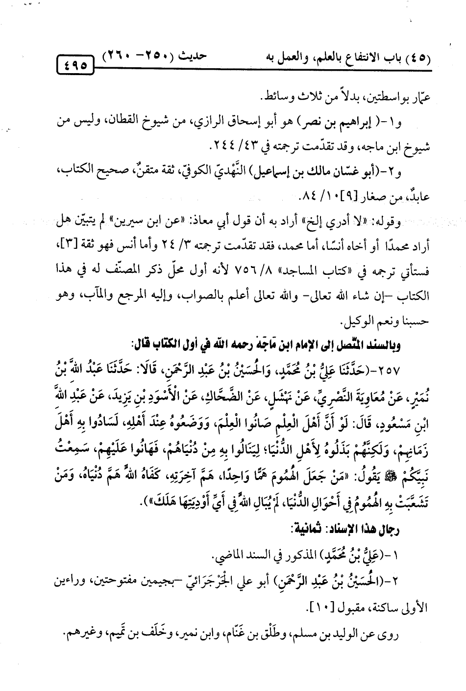 257 - (حَدَّثَنَا عَليُّ بْنُ مُحَمَّدٍ، وَالحُسَيْنُ بْنُ عَبْدِ الرَّحْمَنِ، قَالَا: حَدَّثَنَا عَبْدُ الله بْنُ نُمَيْرٍ، عَنْ مُعَاوِيَةَ النَّصْرِيِّ، عَنْ نَهْشَلٍ، عَنْ الضَّحَّاكِ، عَنْ الْأَسْوَدِ بْنِ يَزِيدَ، عَنْ عَبْدِ الله ابْنِ مَسْعُودٍ، قَالَ: لَوْ أَنَّ أَهْلَ الْعِلْمِ صَانُوا الْعِلْمَ، وَوَضَعُوهُ عِنْدَ أَهْلِهِ، لَسَادُوا بِهِ أَهْلَ زَمَانِهِمْ، وَلَكِنَّهُمْ بَذَلُوهُ لِأَهْلِ الدُّنْيَا؛ لِيَنَالُوا بِهِ مِنْ دُنْيَاهُمْ، فَهَانُوا عَلَيْهِمْ، سَمِعْتُ نَبِيَّكُمْ -صلى الله عليه وسلم- يَقُولُ: "مَنْ جَعَلَ الهُمُومَ هَمًّا وَاحِدًا، هَمَّ آخِرَتِهِ، كَفَاهُ الله هَمَّ دُنْيَاهُ، وَمَنْ تَشَعَّبَتْ بِهِ الهُمُومُ في أَحْوَالِ الدُّنْيَا، لَمْ يُبَالِ الله في أَيِّ أَوْدِيَتِهَا هَلَكَ").