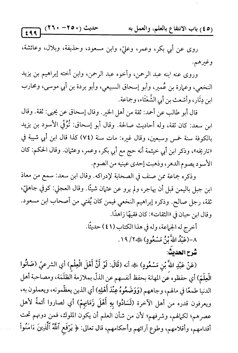 (عَنْ عَبْدِ الله بْنِ مَسْعُودٍ) -رضي الله عنه- أنه (قَالَ: لَوْ أَنَّ أَهْلَ الْعِلْمِ) أي الشرعيّ (صَانُوا الْعِلْمَ) أي حفظوه عن المهانة بحفظ أنفسهم عن الذلّ بملازمة الظلَمَة، ومصاحبة أهل الدنيا طمعًا في مالهم، وجاههم (وَوَضَعُوهُ عِنْدَ أَهْلِهِ) أي الذين يعظّمونه، ويعملون به، ويعرفون قدره من أهل الآخرة (لَسَادُوا بِهِ أَهْلَ زَمَانِهِمْ) أي لصاروا أئمةً لأهل عصرهم؛ لكمالهم، وشرفهم؛ لأن من شأن العلم أن يكون الملوك، فمن دونهم تحت أقدامهم، وأقلامهم، وطوع آرائهم وأحكامهم، قال تعالى: {يَرْفَعِ اللَّهُ الَّذِينَ آمَنُوا