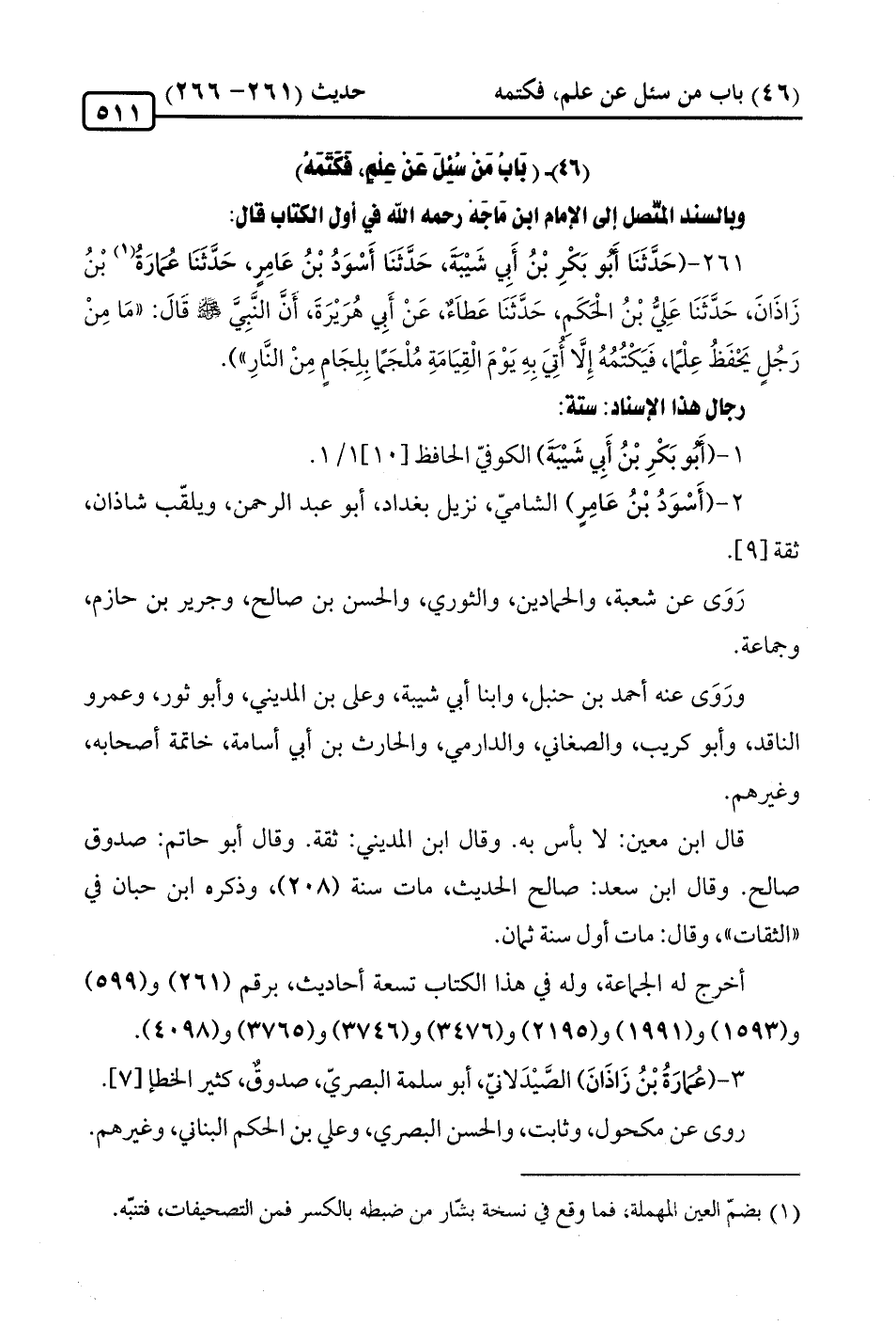 261 - (حَدَّثَنَا أَبُو بَكْرِ بْنُ أَبِي شَيْبَةَ، حَدَّثَنَا أَسْوَدُ بْنُ عَامِرٍ، حَدَّثَنَا عُمارَةُ (¬1) بْنُ زَاذَانَ، حَدَّثَنَا عَليُّ بْنُ الحكَم، حَدَّثَنَا عَطاَءٌ، عَنْ أَبِي هُرَيْرَةَ، أَنَّ النَّبِيَّ -صلى الله عليه وسلم- قالَ: "مَا مِنْ رَجُلٍ يَحْفَظُ عِلْمًا، فَيَكْتُمُهُ إِلَّا أُتِيَ بِهِ يَوْمَ الْقِيَامَةِ مُلْجَمًا بِلِجَامٍ مِنْ النَّارِ").