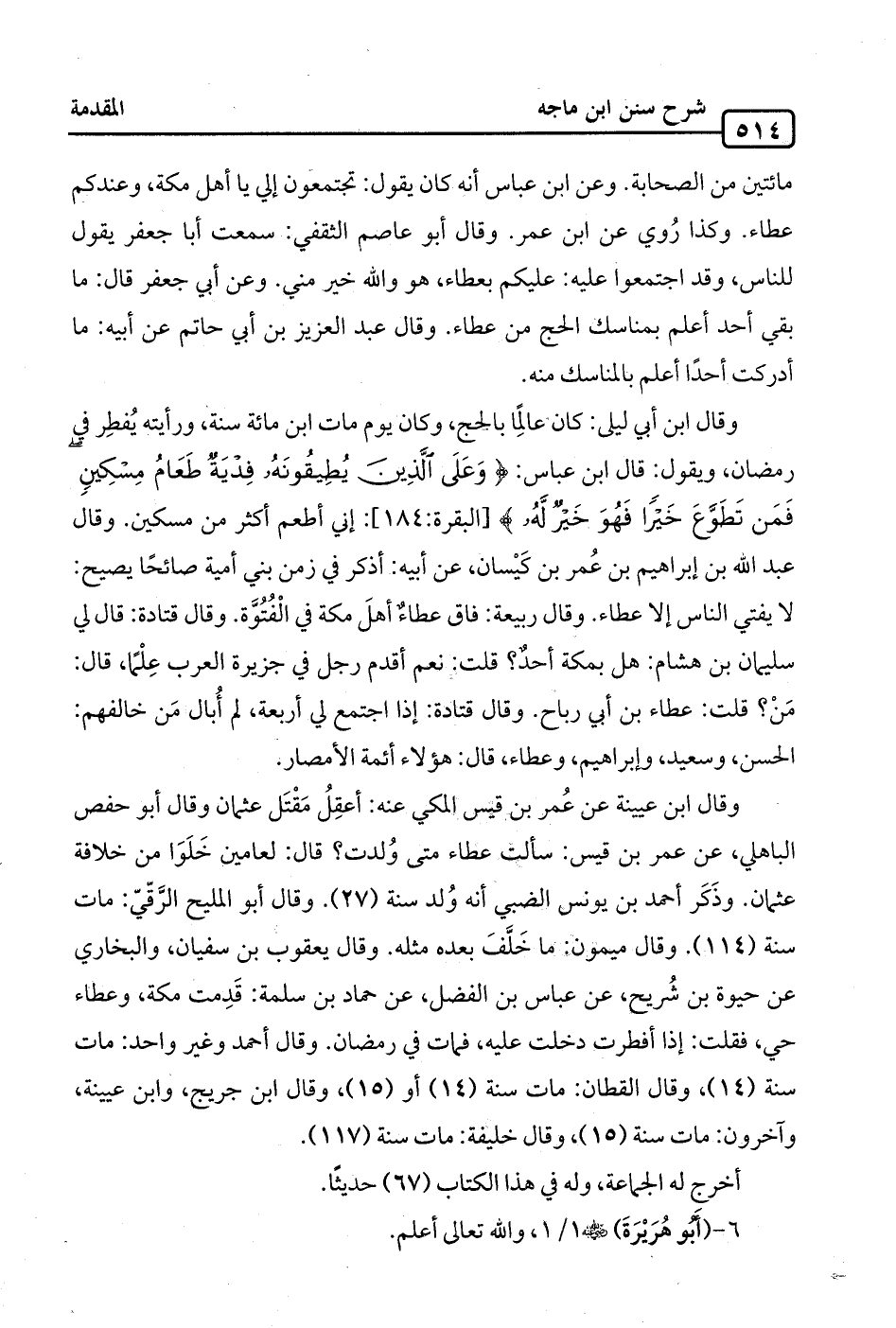 وقال ابن أبي ليلى: كان عالِمًا بالحج، وكان يوم مات ابن مائة سنة، ورأيته يُفطِر في رمضان، ويقول: قال ابن عباس: {وَعَلَى الَّذِينَ يُطِيقُونَهُ فِدْيَةٌ طَعَامُ مِسْكِينٍ فَمَنْ تَطَوَّعَ خَيْرًا فَهُوَ خَيْرٌ لَهُ} [البقرة: 184]: إني أطعم أكثر من مسكين. وقال عبد الله بن إبراهيم بن عُمر بن كَيْسان، عن أبيه: أذكر في زمن بني أمية صائحًا يصيح: لا يفتي الناس إلا عطاء. وقال ربيعة: فاق عطاءٌ أهلَ مكة في الْفُتُوَّة. وقال قتادة: قال لي سليمان بن هشام: هل بمكة أحدٌ؟ قلت: نعم أقدم رجل في جزيرة العرب عِلْمًا، قال: مَنْ؟ قلت: عطاء بن أبي رباح. وقال قتادة: إذا اجتمع لي أربعة، لم أُبال مَن خالفهم: الحسن، وسعيد، وإبراهيم، وعطاء، قال: هؤلاء أئمة الأمصار.