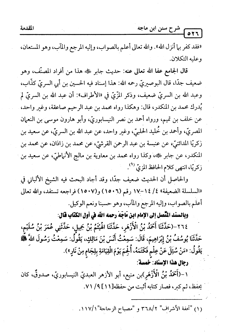 قال الجامع عفا الله تعالى عنه: حديث جابر -رضي الله عنه- هذا من أفراد المصنّف، وهو ضعيف جدّا، قال البوصيريّ رحمه الله: هذا إسناد فيه الحسين بن أبي السريّ كذّاب، وعبد الله بن السريّ ضعيف، وذكر المزّيّ في "الأطراف": أن عبد الله بن السريّ لم يُدرك محمد بن المنكدر، قال: وهكذا رواه محمد بن عبد الرحيم صاعقة، وغير واحد، عن خلف بن تميم، ورواه أحمد بن نصر النيسابوريّ، وأبو هارون موسى بن النعمان المصريّ، وأحمد بن خُليد الحلبيّ، وغير واحد، عن عبد الله بن السريّ، عن سعيد بن زكريّا المدائنيّ عن عنبسة بن عبد الرحمن القرشيّ، عن محمد بن زاذان، عن محمد بن المنكدر، عن جابر -رضي الله عنه-، وكذا رواه محمد بن معاوية بن مالج الأنماطيّ، عن سعيد بن زكريّا، انتهى كلام الحافظ المزيّ (¬1).