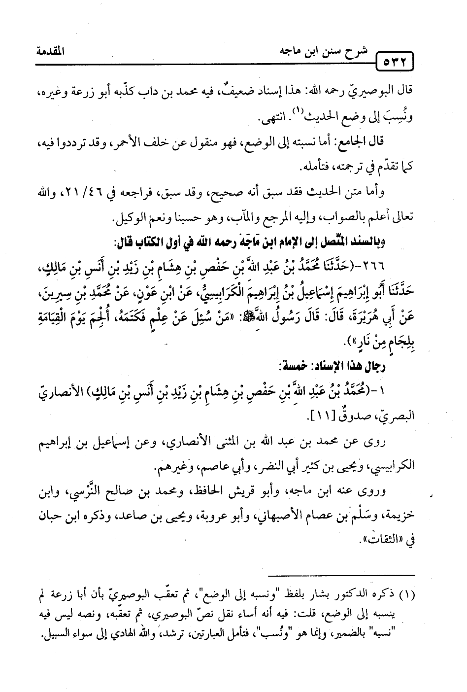 (¬1) ذكره الدكتور بشار بلفظ "ونسبه إلى الوضع"، ثم تعقّب البوصيريّ بأن أبا زرعة لم ينسبه إلى الوضع، قلت: فيه أنه أساء نقل نصّ البوصيري، ثم تعقبه، ونصه ليس فيه "نسبه" بالضمير، وإنما هو "ونُسب"، فتأمل العبارتين، ترشد، والله الهادي إلى سواء السبيل.