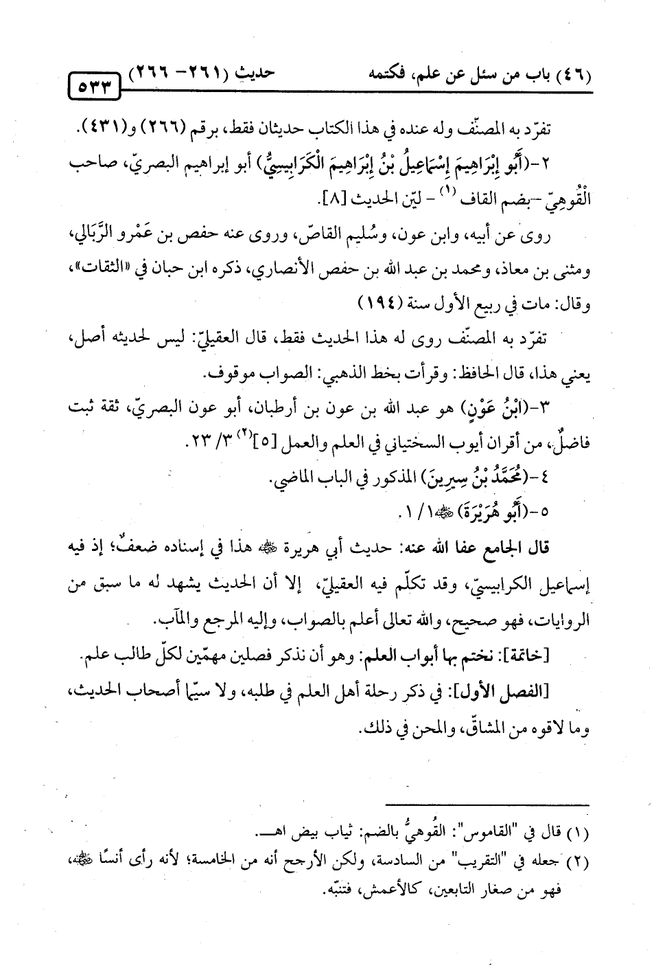 3 - (ابْنُ عَوْنٍ) هو عبد الله بن عون بن أرطبان، أبو عون البصريّ، ثقة ثبت فاضلٌ، من أقران أيوب السختياني في العلم والعمل [5] (¬2) 3/ 23.