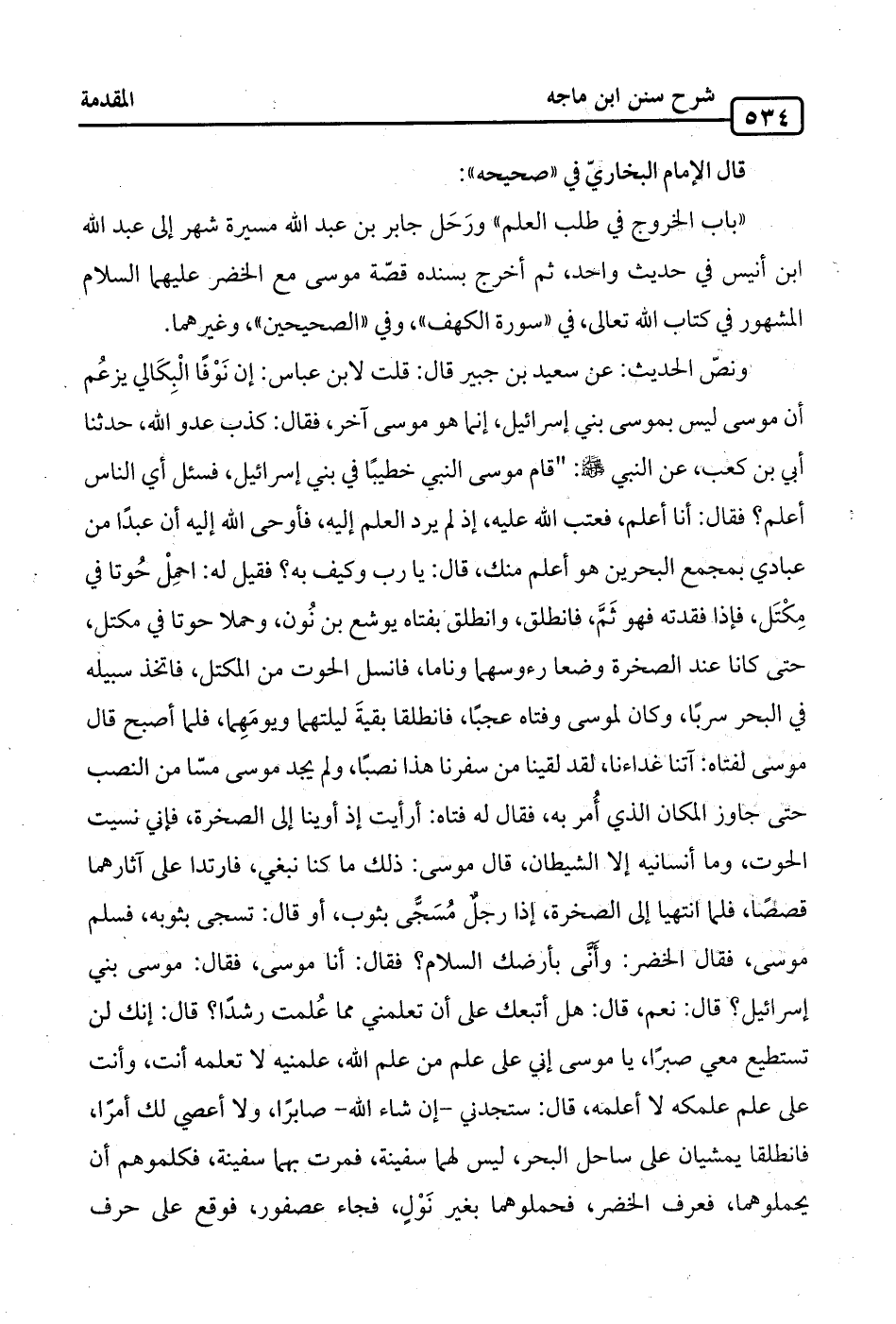 "باب الخروج في طلب العلم" ورَحَل جابر بن عبد الله مسيرة شهر إلى عبد الله ابن أنيس في حديث واحد، ثم أخرج بسنده قصّة موسى مع الخضر عليهما السلام المشهور في كتاب الله تعالى، في "سورة الكهف"، وفي "الصحيحين"، وغيرهما.