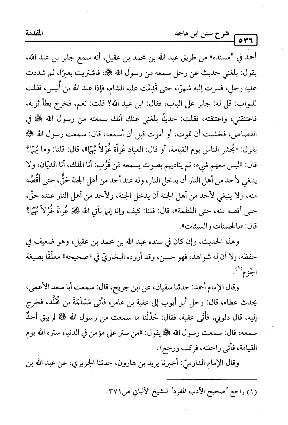 أحمد في "مسنده" من طريق عبد الله بن محمد بن عقيل، أنه سمع جابر بن عبد الله، يقول: بلغني حديث عن رجل سمعه من رسول الله -صلى الله عليه وسلم-، فاشتريت بعيرًا، ثم شددت عليه رحلي، فسرت إليه شهرًا، حتى قَدِمُت عليه الشام، فإذا عبد الله بن أُنيس، فقلت للبواب: قل له: جابر على الباب، فقال: ابن عبد الله؟ قلت: نعم، فخرج يطأ ثوبه، فاعتنقني، واعتنقته، فقلت: حديثًا بلغني عنك أنك سمعته من رسول الله -صلى الله عليه وسلم- في القصاص، فخشيت أن تموت، أو أموت قبل أن أسمعه، قال: سمعت رسول الله -صلى الله عليه وسلم- يقول: "يُحشر الناس يوم القيامة، أو قال: العباد عُراةً غُرْلًا بُهْمًا"، قال: قلنا: وما بُهمًا؟ قال: "ليس معهم شيء، ثم يناديهم بصوت يسمعه مَن قَرُب: أنا الملك، أنا الديّان، ولا ينبغي لأحد من أهل النار أن يدخل النار، وله عند أحد من أهل الجنة حَقٌّ، حتى أَقُصَّه منه، ولا ينبغي لأحد من أهل الجنة أن يدخل الجنة، ولأحد من أهل النار عنده حقّ، حتى أقصه منه، حتى اللطمة"، قال: قلنا: كيف وإنا إنما نأتي الله عز وجل عُراةً غُرْلًا بُهْمًا؟ قال: "بالحسنات والسيئات".