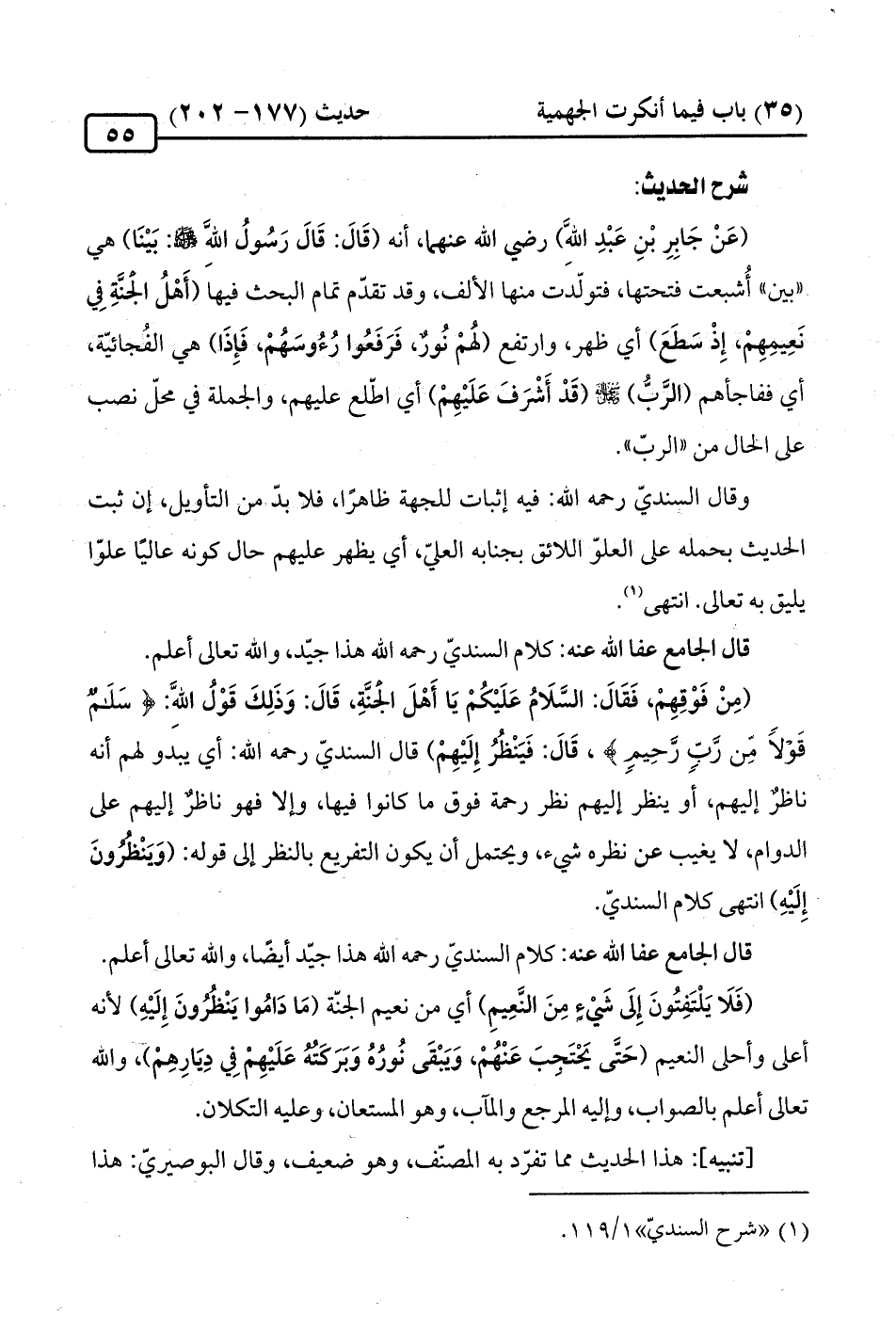 (مِنْ فَوْقِهِمْ، فَقَالَ: السَّلَامُ عَلَيْكُمْ يَا أَهْلَ الجنَّةِ، قَالَ: وَذَلِكَ قَوْلُ الله: {سَلَامٌ قَوْلًا مِنْ رَبٍّ رَحِيمٍ}، قَالَ: فَيَنْظُرُ إِلَيْهِمْ) قال السنديّ رحمه الله: أي يبدو لهم أنه ناظرٌ إليهم، أو ينظر إليهم نظر رحمة فوق ما كانوا فيها، وإلا فهو ناظرٌ إليهم على الدوام، لا يغيب عن نظره شيء، ويحتمل أن يكون التفريع بالنظر إلى قوله: (وَيَنْظرونَ إِلَيْهِ) انتهى كلام السنديّ.