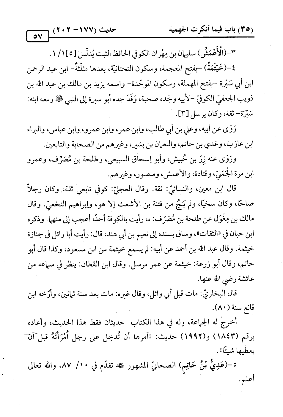 4 - (خَيْثَمَةُ) -بفتح المعجمة، وسكون التحتانيّة، بعدها مثلّثةٌ- ابن عبد الرّحمن ابن أبي سَبْرة -بفتح المهملة، وسكون الموحّدة- واسمه يزيد بن مالك بن عبد الله بن ذويب الجعفيّ الكوفيّ -لأبيه ولجده صحبة، وَفَدَ جده أبو سبرة إلى النّبيّ -صلى الله عليه وسلم- ومعه ابنه: سَبْرَة- ثقة، وكان يرسل [3].
