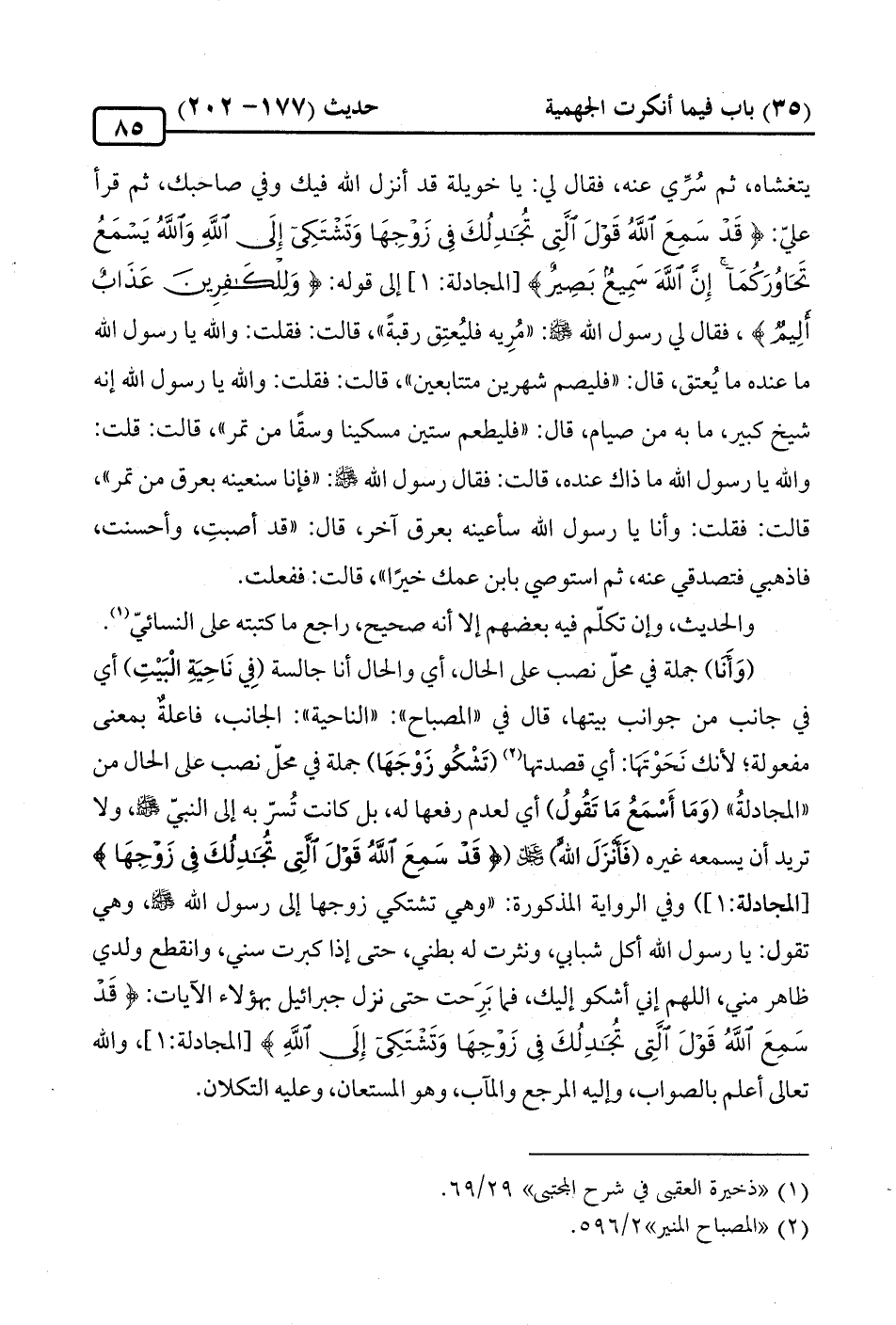 يتغشاه، ثمّ سُرِّي عنه، فقال لي: يا خويلة قد أنزل الله فيك وفي صاحبك، ثمّ قرأ عليّ: {قَدْ سَمِعَ اللهُ قَوْلَ الَّتِي تُجَادِلُكَ في زَوْجِهَا وَتَشْتَكِي إِلَى اللهِ وَاللهُ يَسْمَعُ تَحَاوُرَكُمَا إِنَّ اللهَ سَمِيعٌ بَصِيرٌ} [المجادلة: 1]، إلى قوله: {وَلِلْكَافِرِينَ عَذَابٌ أَلِيمٌ}، فقال لي رسول الله - صلّى الله عليه وسلم -: "مُرِيه فليُعتِق رقبةً"، قالت: فقلت: والله يا رسول الله ما عنده ما يُعتق، قال: "فليصم شهرين متتابعين"، قالت: فقلت: والله يا رسول الله إنّه شيخ كبير، ما به من صيام، قال: "فليطعم ستين مسكينا وسقًا من تمر"، قالت: قلت: والله يا رسول الله ما ذاك عنده، قالت: فقال رسول الله - صلّى الله عليه وسلم -: "فإنا سنعينه بعرق من تمر"، قالت: فقلت: وأنا يا رسول الله سأعينه بعرق آخر، قال: "قد أصبتِ، وأحسنت، فاذهبي فتصدقي عنه، ثمّ استوصي بابن عمك خيرًا"، قالت: ففعلت.