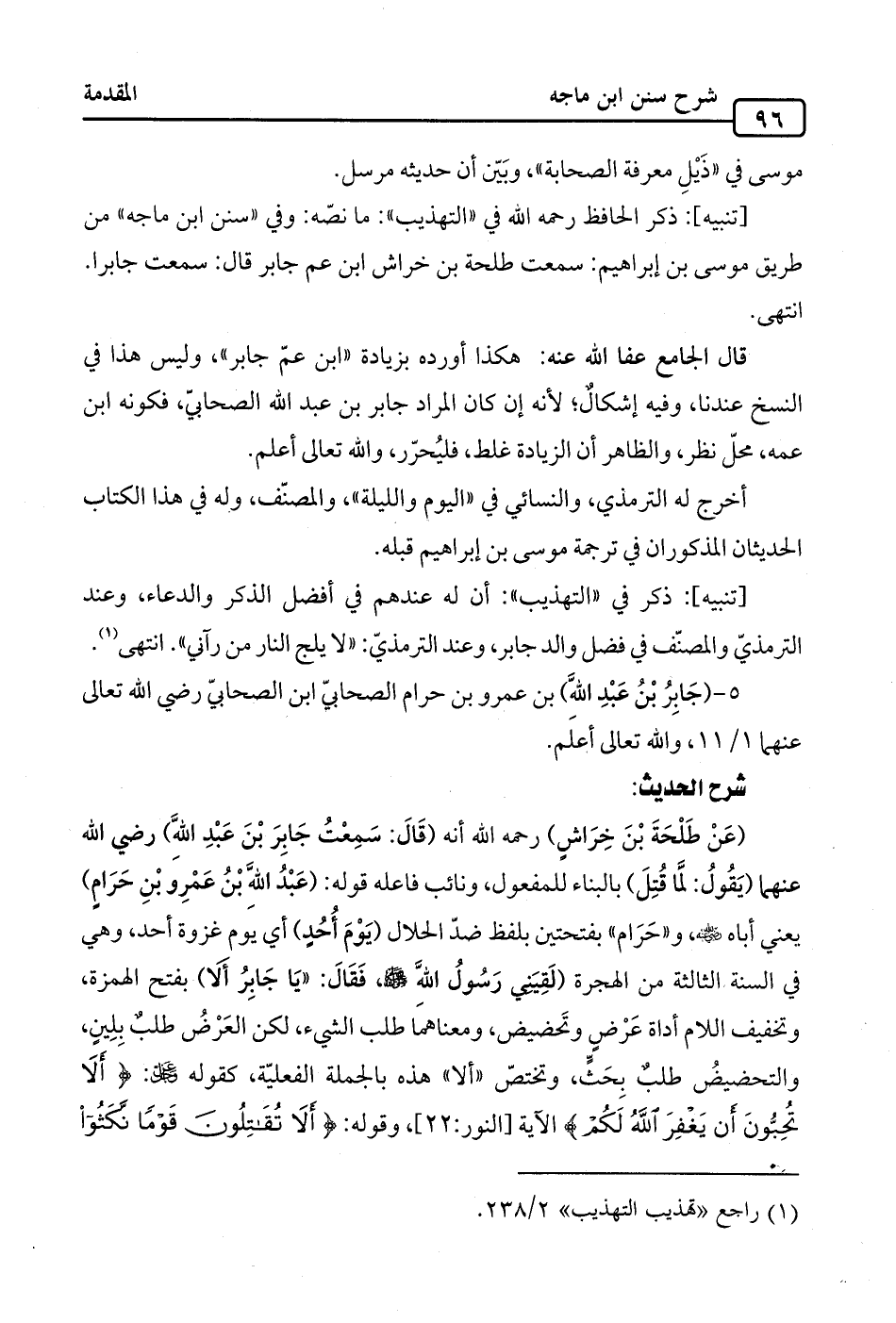 [تنبيه]: ذكر الحافظ رحمه الله في "التهذيب": ما نصّه: وفي "سنن ابن ماجه" من طريق موسى بن إبراهيم: سمعت طلحة بن خراش ابن عم جابر قال: سمعت جابرًا. انتهى.