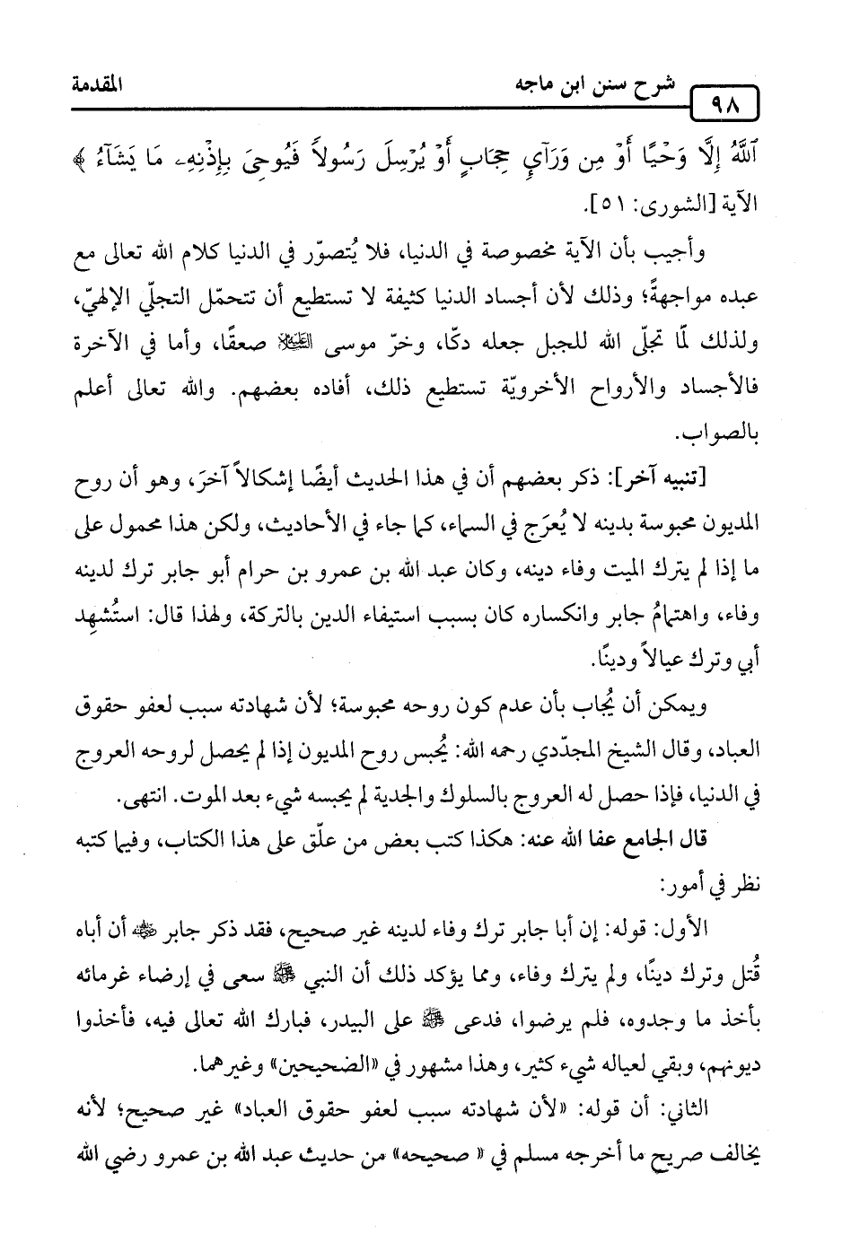 [تنبيه آخر]: ذكر بعضهم أن في هذا الحديث أيضًا إشكالًا آخرَ، وهو أن روح المديون محبوسة بدينه لا يُعرَج في السَّماء، كما جاء في الأحاديث، ولكن هذا محمول على ما إذا لم يترك الميِّت وفاء دينه، وكان عبد الله بن عمرو بن حرام أبو جابر ترك لدينه وفاء، واهتمامُ جابر وانكساره كان بسبب استيفاء الدين بالتركة، ولهذا قال: استُشهِد أبي وترك عيالًا ودينًا.