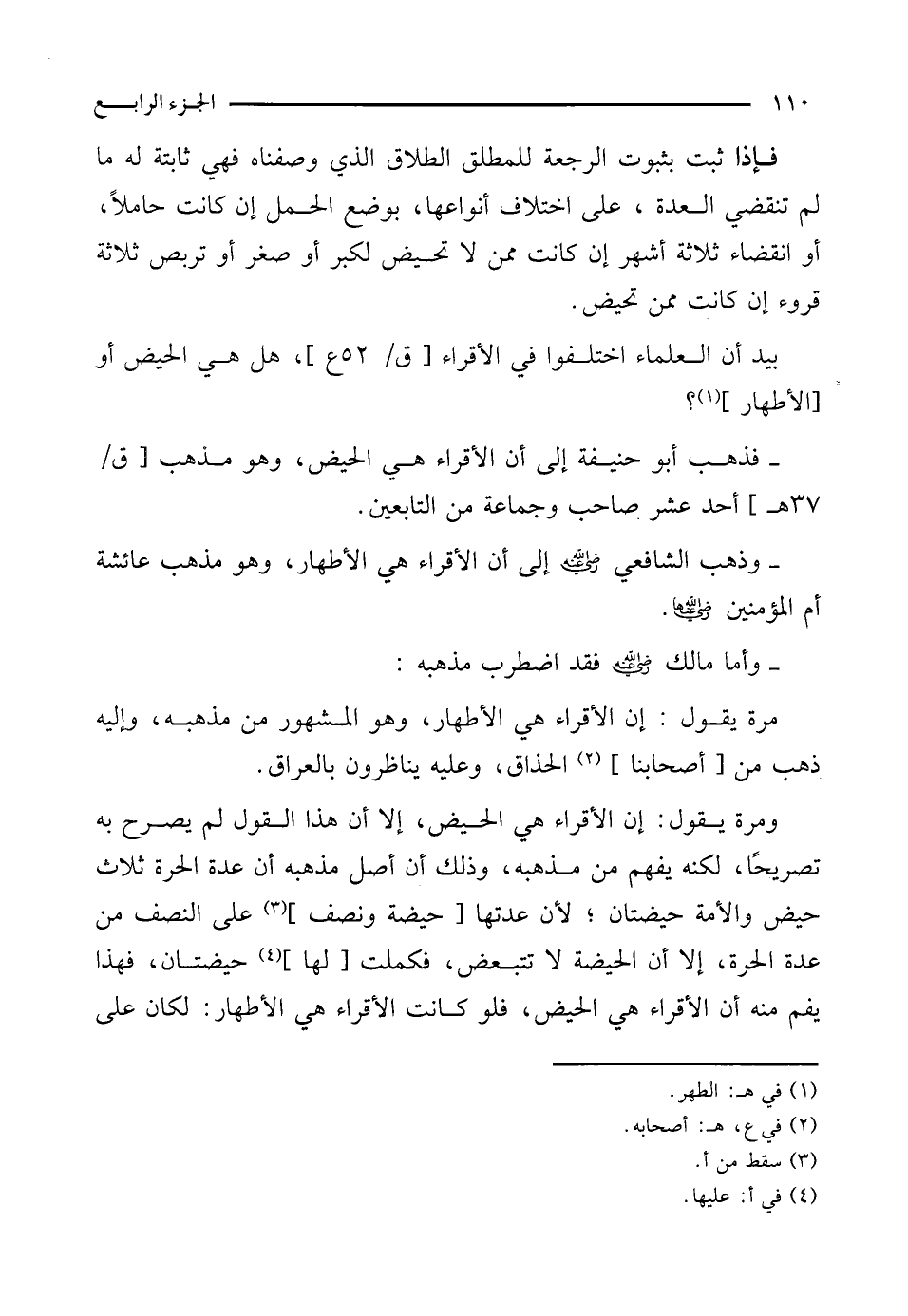 - وذهب الشافعي - رضي الله عنه - إلى أن الأقراء هي الأطهار، وهو مذهب عائشة أم المؤمنين - رضي الله عنها -.