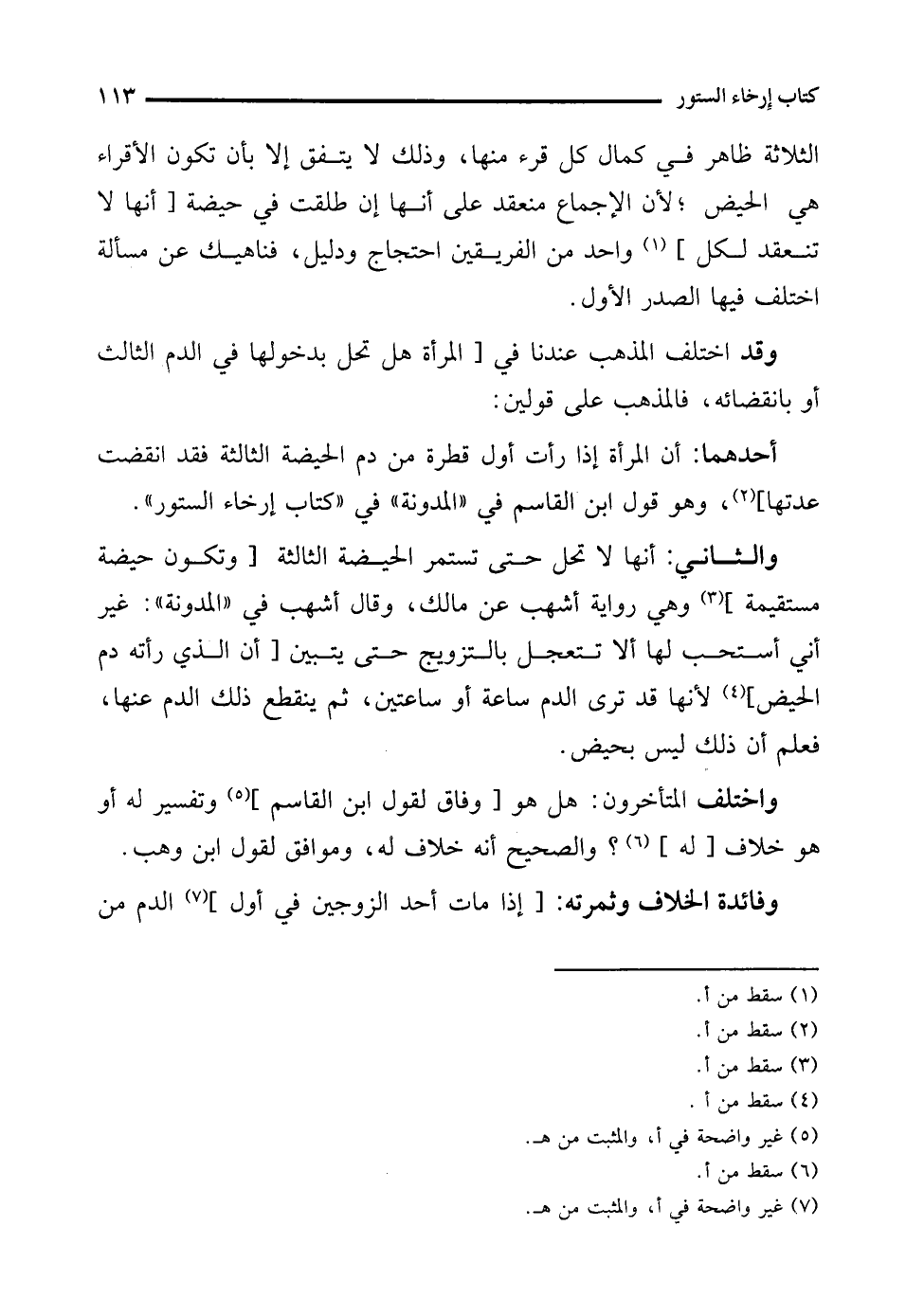 وقد اختلف المذهب عندنا في [المرأة هل تحل بدخولها في الدم الثالث أو بانقضائه، فالمذهب على قولين: