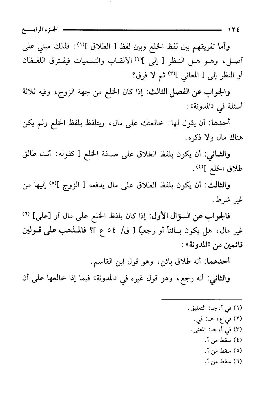 فالجواب عن السؤال الأول: إذا كان بلفظ الخلع على مال أو [على] (¬6) غير مال، هل يكون بائنا أو رجعيًا؟ فالمذهب على قولين قائمين من "المدونة":