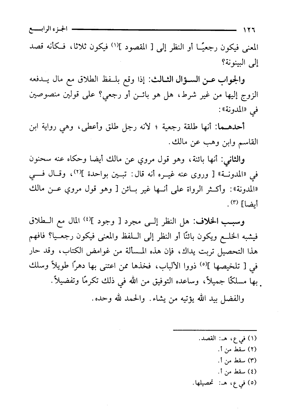 وسبب الخلاف: هل النظر إلى مجرد [وجود] (¬4) المال مع الطلاق فيشبه الخلع ويكون بائنًا أو النظر إلى اللفظ والمعنى فيكون رجعيا؟ فافهم هذا التحصيل تربت يداك، فإن هذه المسألة من غوامض الكتاب، وقد حار في [تلخيصها] (¬5) ذووا الألباب، فخذها ممن اعتنى بها دهرًا طويلًا وسلك بها مسلكًا جميلًا، وساعده التوفيق من الله في ذلك تكرمًا وتفضيلًا.