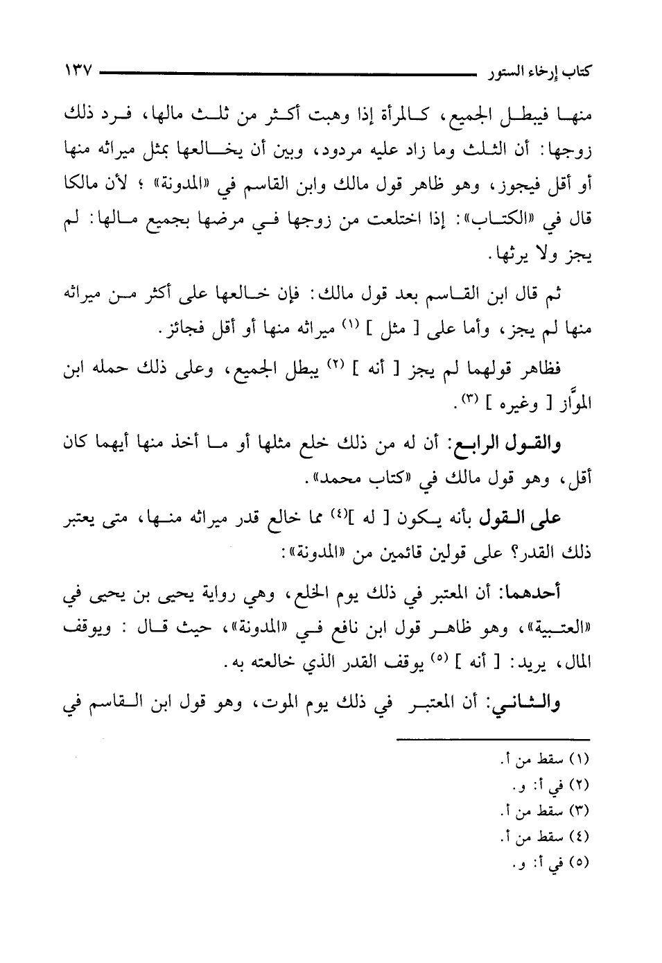 ثم قال ابن القاسم بعد قول مالك: فإن خالعها على أكثر من ميراثه منها لم يجز، وأما على [مثل] (¬1) ميراثه منها أو أقل فجائز.