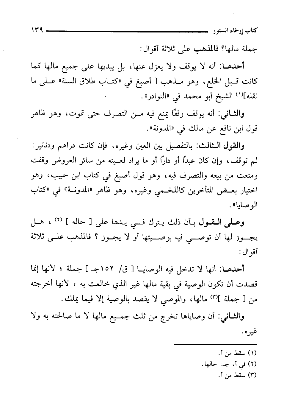 والقول الثالث: بالتفصيل بين العين وغيره، فإن كانت دراهم ودنانير: لم توقف، وإن كان عبدًا أو دارًا أو ما يراد لعينه من سائر العروض وقفت ومنعت من بيعه والتصرف فيه، وهو قول أصبغ في كتاب ابن حبيب، وهو اختيار بعض المتأخرين كاللخمي وغيره، وهو ظاهر "المدونة" في "كتاب الوصايا".