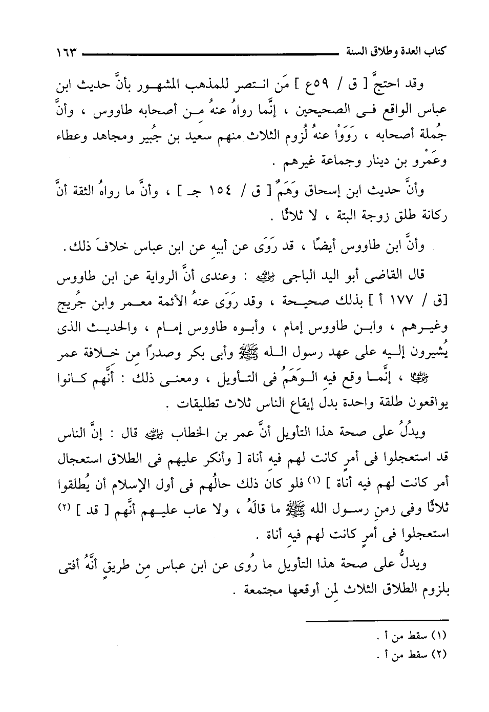 قال القاضى أبو الوليد الباجي - رضي الله عنه -: وعندى أنَّ الرواية عن ابن طاووس بذلك صحيحة، وقد رَوَى عنهُ الأئمة معمر وابن جُريج وغيرهم، وابن طاووس إمام، وأبوه طاووس إمام، والحديث الذي يشيرون إليه على عهد رسول الله - صلى الله عليه وسلم - وأبى بكر وصدرًا مِن خلافة عمر - رضي الله عنهما -، إنَّما وقع فيهِ الوَهَم في التأويل، ومعنى ذلك: أَنَّهم كانوا يواقعون طلقة واحدة بدل إيقاع الناس ثلاث تطليقات.