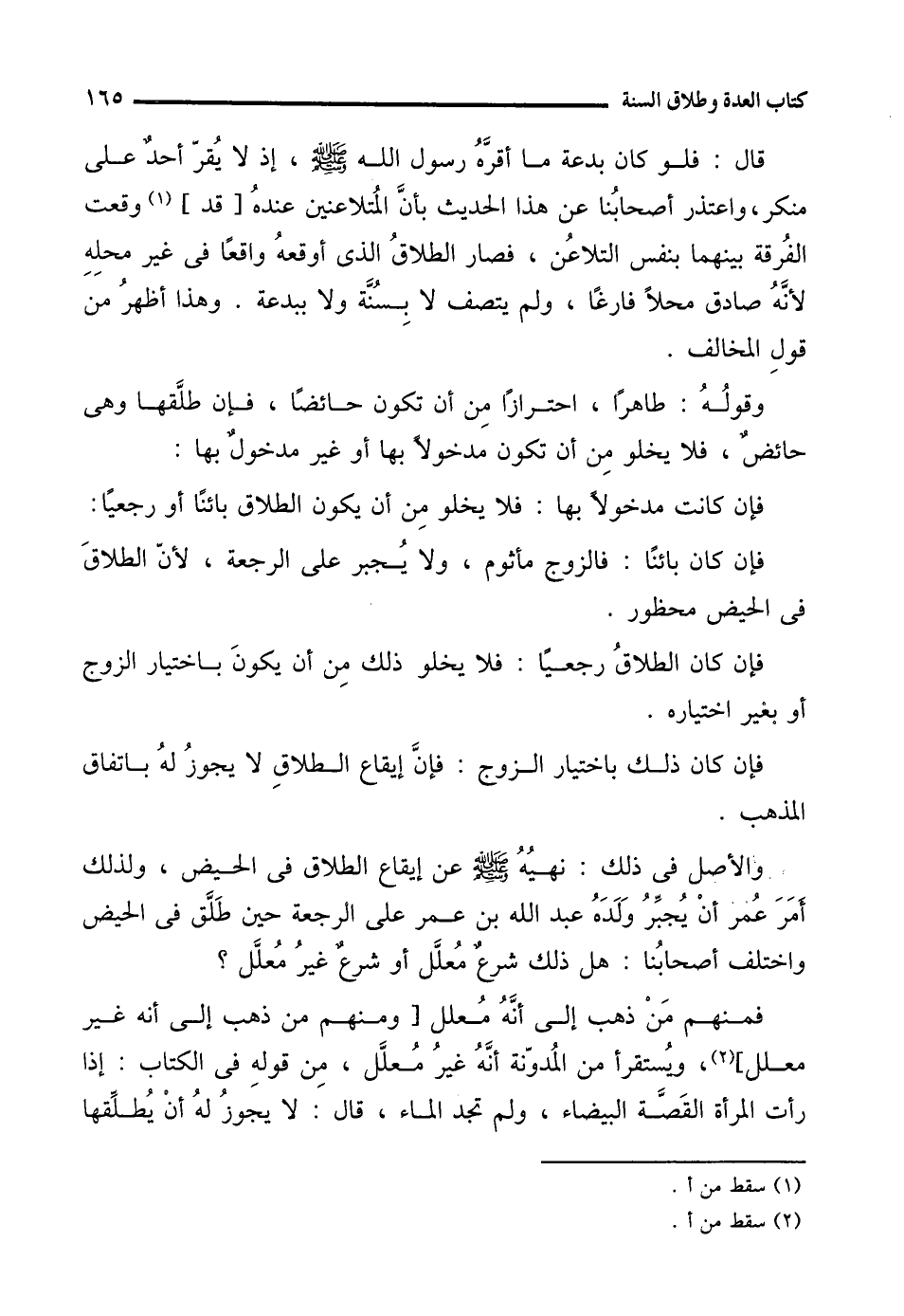 والأصل في ذلك: نهيُهُ - صلى الله عليه وسلم - عن إيقاع الطلاق في الحيض، ولذلك أمَرَ عُمر أنْ يُجبِّرُ وَلَدَهُ عبد الله بن عمر على الرجعة حين طَلَّق في الحيض واختلف أصحابُنا: هل ذلك شرع مُعلَّل أو شرعٌ غيرُ مُعلَّل؟